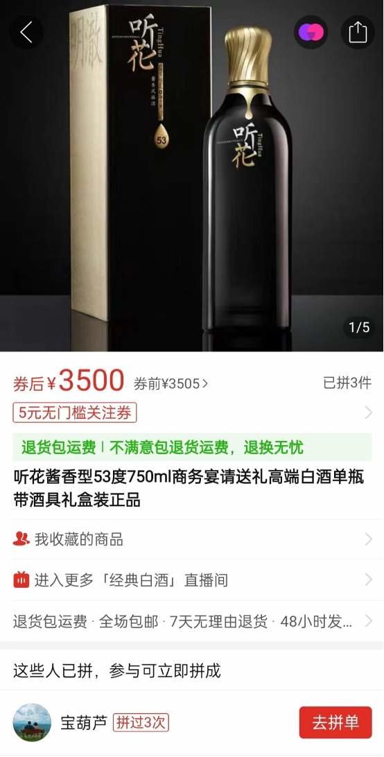 大望财讯在拼多多平台搜索听花酒时,发现该平台听花酒拼单成功的只有一家店,酒的类型是听花酒酱香型,销量为3件,而且都是一位名为“宝葫芦”的人拼成的。值得注意的是,在该平台搜索听花酒的其他种类时,均显示有多少人想拼,但是并没有拼单成功的。