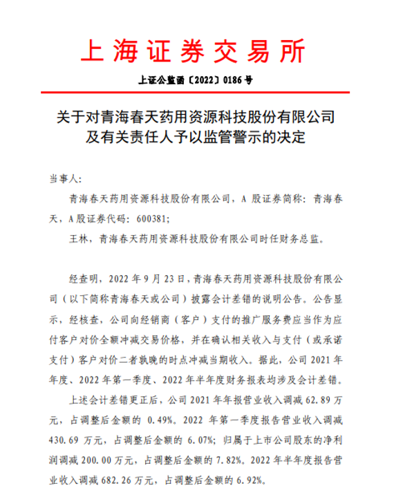 12月12日,据上交所披露公告,对青海春天药用资源科技股份有限公司(以下简称“青海春天”)及有关责任人予以监管警示,原因是青海春天未对推广服务费进行合理的会计处理,其收入确认存在会计差错,导致2021年年度、2022年第一季度、2022年半年度定期报告财务数据披露不准确。