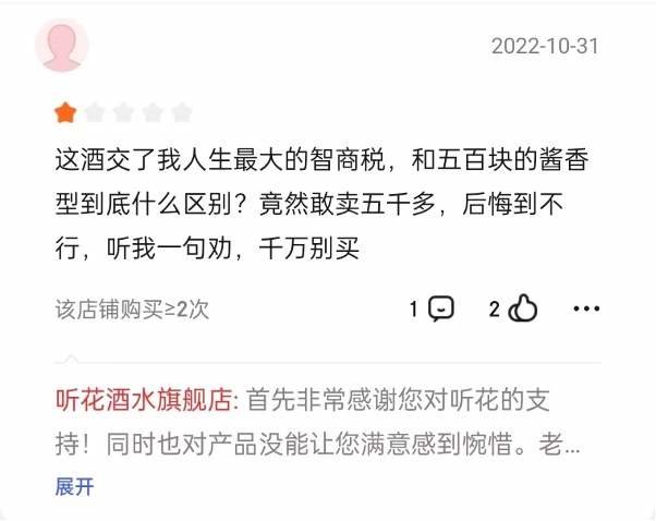 目前,在京东电商平台的听花酒官方旗舰店中,标价为5.86万元的酱香听花酒精品装销量仅3件,标价5860元的酱香听花酒标准版销量不足300件。在听花酒浓香标准装的评价中,我们发现有消费者对听花酒的口感存在质疑,认为该产品是智商税。