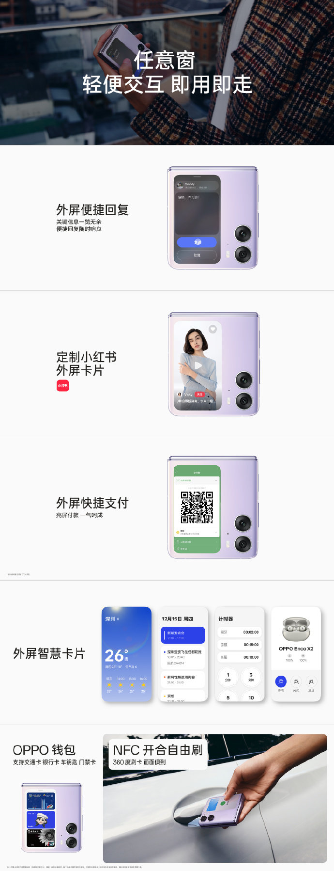 外屏交互方面,OPPO也做了深度思考。小折叠手机的外屏既不能只是一个简单的“通知栏”,也不应该是过于复杂的“小手机”界面。因此OPPO在OPPO Find N2 Flip这块独创的大外屏上,带来了全新的轻交互体验「任意窗」,满足“即用即走”的需求。