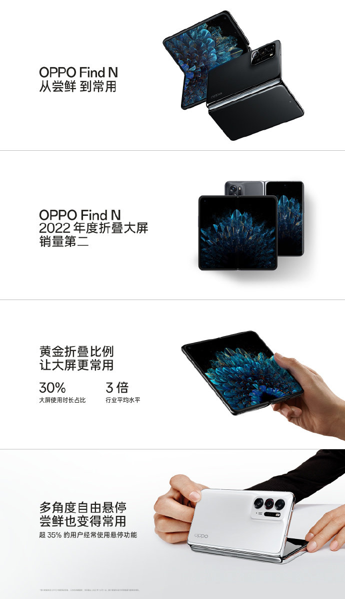 OPPO去年发布了首款折叠手机Find N并取得了2022年折叠大屏手机全国销量第二的成绩。OPPO Find N凭借其“黄金折叠比例”的尺寸设计,让用户的大屏使用时长占比超30%,是行业平均水平的3倍,经常使用悬停功能的用户占比达35%,推动折叠手机从尝鲜到常用。