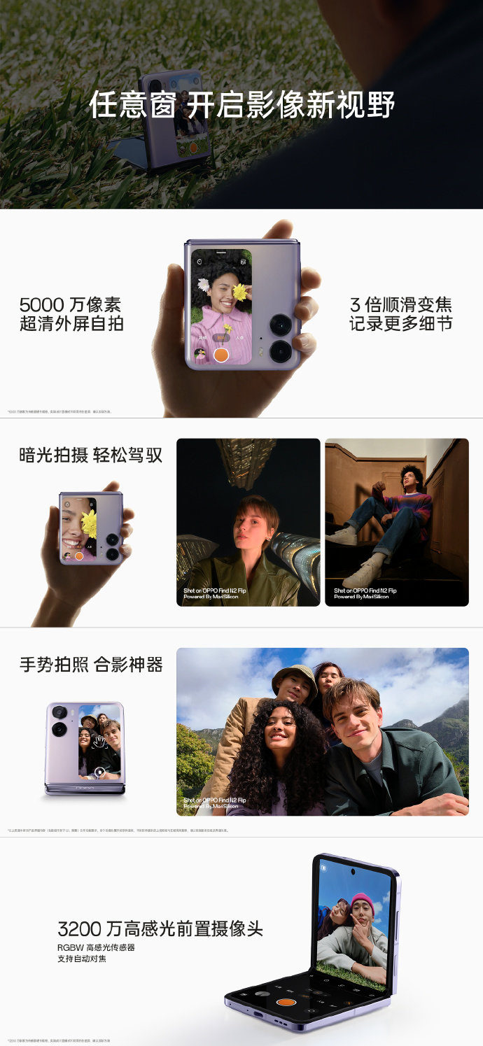 影像实力上, OPPO Find N2 Filp配置了5000万像素后置主摄,带来超清外屏自拍,并支持高达3倍的顺滑变焦;超清夜景算法轻松驾驭暗光拍摄;手势快速触发快门,让合影不再少一人。3200万高感光前置摄像头,支持自动对焦,自拍从此大不同。Find N2 Filp同样使用了自研影像专用NPU芯片马里亚纳®MariSilicon X,并搭配OPPO|哈苏手机影像系统,带来强劲的影像体验。