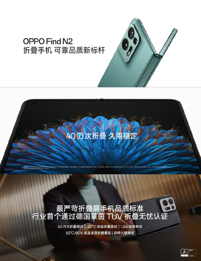 OPPO Find N2的折叠测试标准从上一代的20万次提升到40万次,并通过了多项极限环境下的折叠测试,真正做到了久用且稳定。并且成为通过莱茵折叠无忧认证,作为目前行业最严苛的折叠手机品质标准,它涵盖了48个严格的测试,Find N2是行业首款通过莱茵折叠无忧认证的手机。