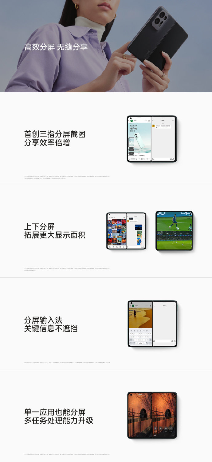 OPPO Find N2还首创三指分屏截图功能,满足多样的分屏截图需求,让效率倍增;在左右分屏的基础上,支持全新上下分屏;同时支持全新输入法分屏,可任意切换键盘位置,不遮挡两边分屏的应用画面;单一应用也能分屏,提升多任务处理能力。