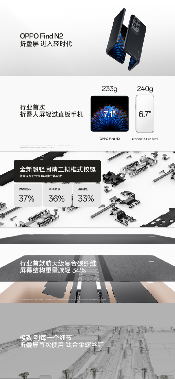 OPPO Find N2成功挑战“掌上超级工程”,真正做到了极致轻巧、坚韧可靠。拥有超轻固精工拟椎式铰链、行业首款航天级复合碳纤维屏幕支撑结构,并且在折叠屏上首次使用钛合金螺丝钉,整机重量仅有233g,折叠手机首次做到比直板手机还轻!