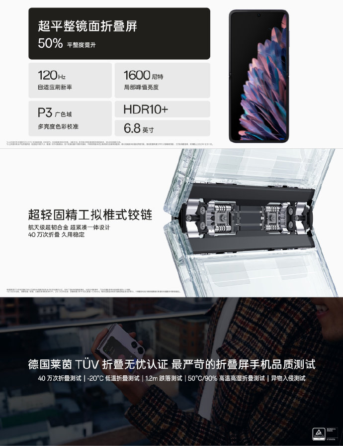 OPPO Find N2 Flip拥有6.8英寸的超平整镜面折叠大屏,屏幕平整度提升50%;采用超轻固精工拟椎式铰链,40万次折叠,久用稳定,并且Find N2 Flip同样通过了“德国莱茵折叠无忧认证”严苛标准,品质无忧,长久耐用。