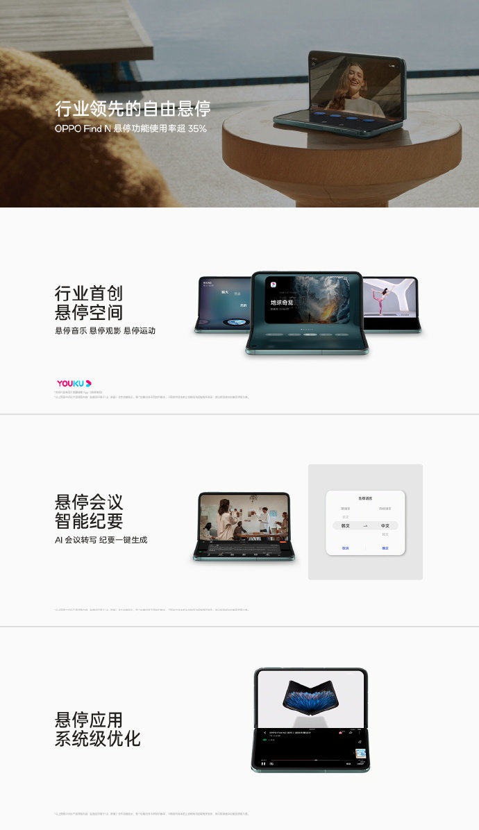 OPPO Find N2行业首创悬停空间:轻松一折,即可进入悬停空间,显示支持悬停使用的应用,无论看视频、听音乐还是做瑜伽,都能快速启动,上看下用。此外,OPPO Find N2还拥有悬停会议功能,支持字幕转写功能,下半屏可以实时记录会议纪要或进行实时翻译。