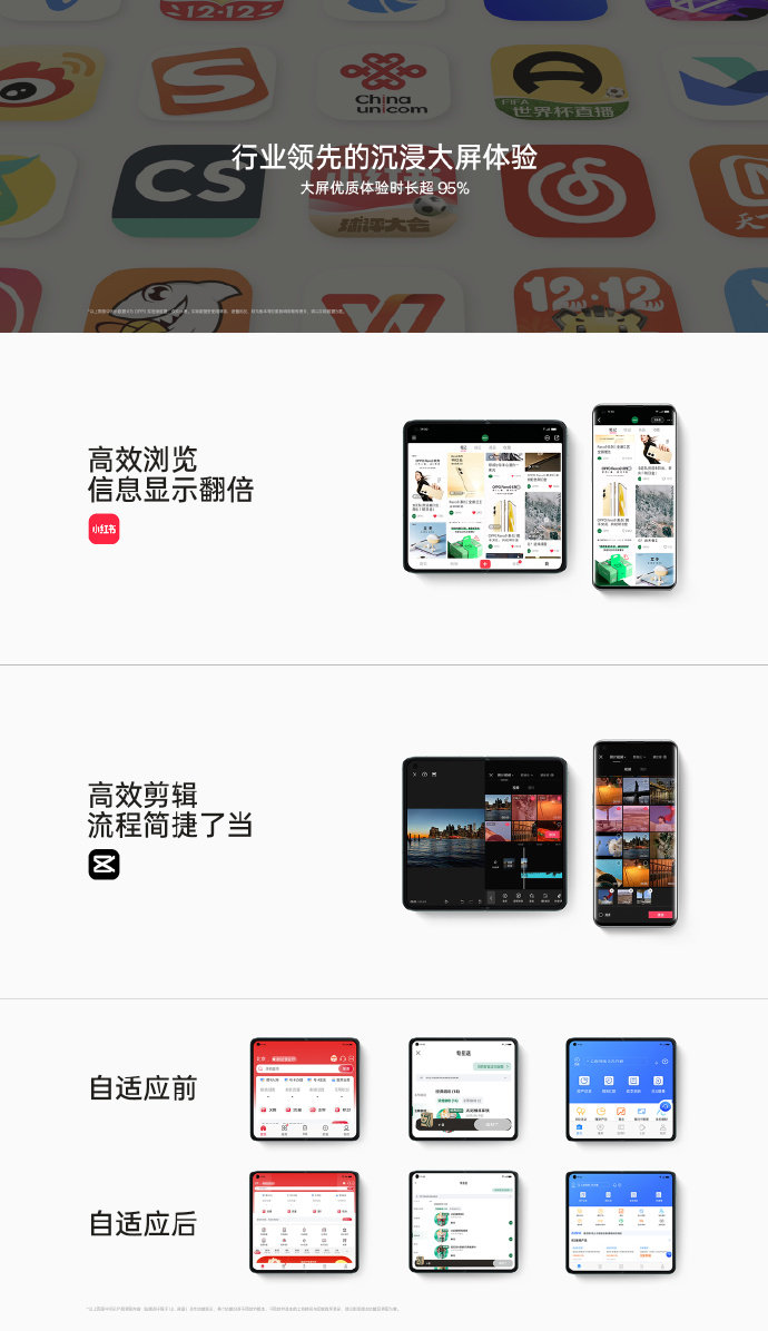 在过去一年,OPPO不断和超级应用深度合作,提升应用内信息显示效率,简化创作流程等。此外,OPPO自研系统级适配技术——UI自适应框架,可以通过强大的引擎能力,识别出适配问题并自动修复;OPPO Find N2对本项技术的应用,已经覆盖了很多日常应用甚至是地方性应用,适配不再是难题!