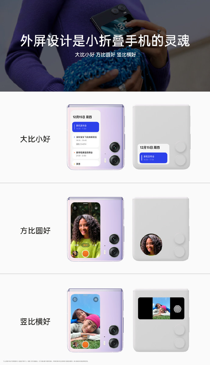 外屏设计作为小折叠手机的灵魂,OPPO做了非常多的思考。形态上,总结出三大原则,即大比小好、方比圆好、竖比横好。OPPO Find N2 Flip的大外屏能让信息展现更加全面,一目了然;方形设计在拍照的时候,画面几乎不会被裁切,预览更完整;竖屏设计显示信息数量更多,操作也更方便。