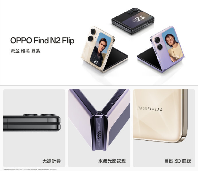 除了Find N2,OPPO还带了全新的竖折旗舰,OPPO Find N2 Flip,拥有流金、雅黑、慕紫三款配色。自然3D曲线机身,完美贴合手掌设计;对于转轴处的水波光影纹理,采用了微米级雕刻工艺;同时,无缝闭合的设计,无论开合,都无懈可击。