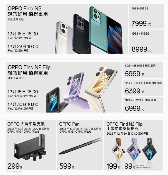 OPPO Find N2 12GB+256GB版本售价7999元,16GB+512GB版本售价8999元;OPPO Find N2 Flip 8GB+256GB版本售价5999元,12GB+256GB版本售价6399元,16GB+512GB版本售价6999元。