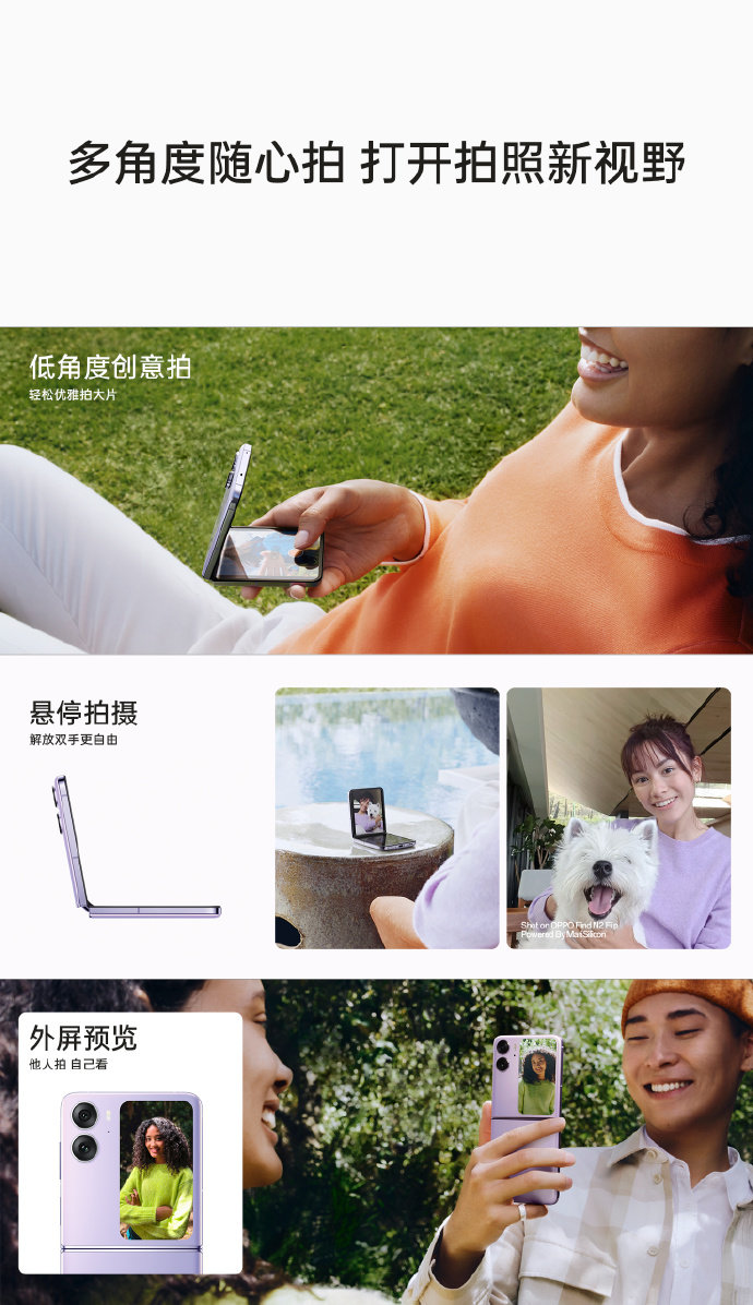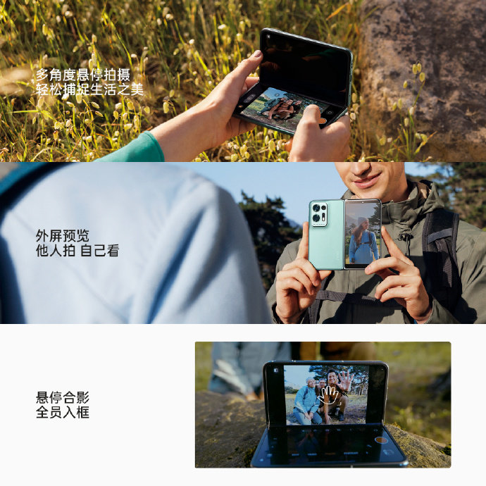 OPPO Find N2还支持多角度悬停拍摄,可使用外屏预览,让被拍的人,也能清楚看到自己的画面,想摆什么Pose就摆什么Pose,支持悬停合影,秒变自带三脚架的大屏相机,前后置都可以随时随地轻松合影。