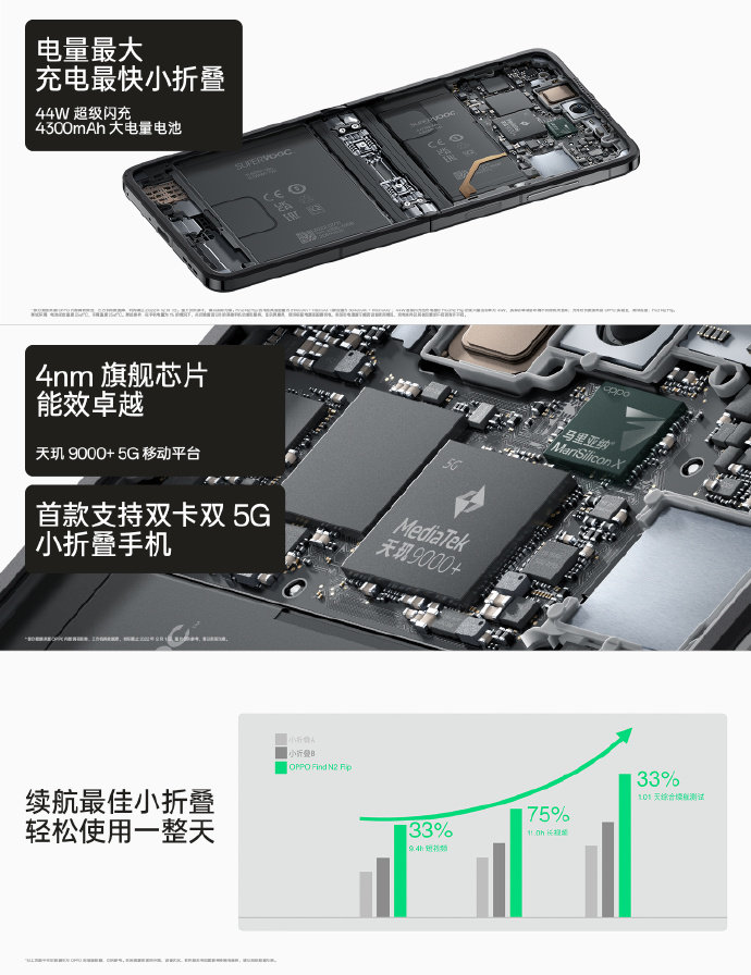 续航方面,OPPO Find N2 Flip拥有4300mAh大电量电池,支持44W超级闪充,搭配能效卓越的天玑9000+旗舰芯,配合Color OS超算平台,刷新小折叠续航新标准,轻松使用一整天。同时,Find N2 Flip是行业首个支持双卡双5G的小折叠手机。