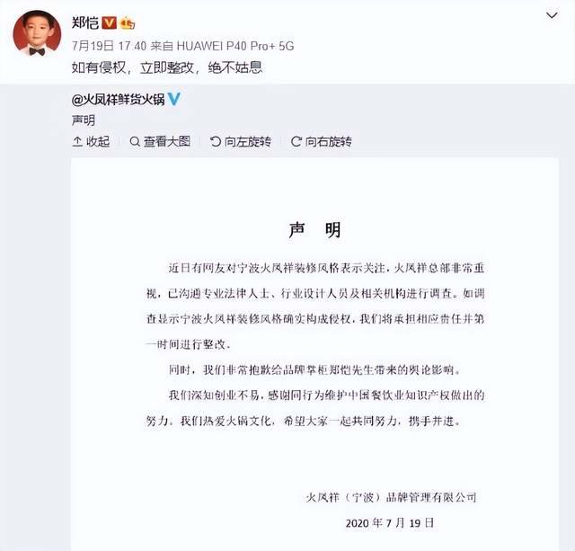 2020年,郑恺的火锅店“龙凤祥”涉及侵权上了热搜。
