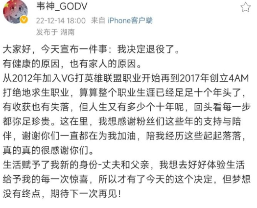 GODV表示:“因为身体健康与家人的原因,我决定退役。从2012年加入VG打英雄联盟职业开始,再到2017年创立4AM打绝地求生职业,算算整个职业生涯已经足足十个年头,有收获也有失落,感谢粉丝们的陪伴和支持。生活赋予了我新的身份,我想去好好体验生活给与我的每一份惊喜,所以才有了今天的这个决定!”