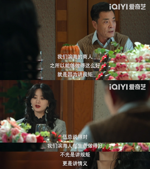 伍建设为了缓和郭启东和许半夏之间的关系,专门组局让郭启东给许半夏道歉。伍建设在酒桌上表示滨海的商人之所以能够做的这么好就是因为讲规矩,许半夏听了这番话,严肃冷淡的态度也缓和了下来,举起酒杯就闷掉了一杯白酒,表示滨海人做生意做得好不光是讲规矩更是讲情义,和郭启东的这件恩怨就算是过了。