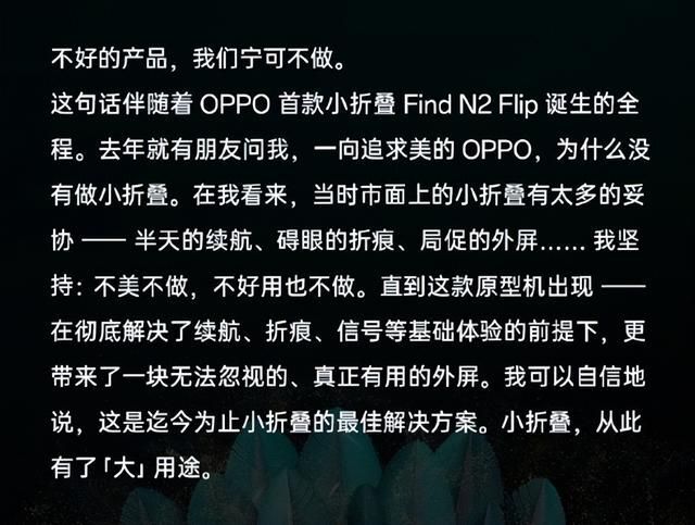 其实刘作虎在微博中已经提到了,目前市面上很多纵向折叠屏手机有太多妥协。比如只能坚持半天的续航、碍眼的折痕以及局促的外屏等。而OPPO Find N2 Flip的到来已经通过技术革新彻底解决了纵向折叠屏手机在在使用中的这些痛点。尤其OPPO Find N2 Flip上还有一块无法忽视的真正有用的外屏,这会成为这款这款折叠屏手机身上非常大的亮点。