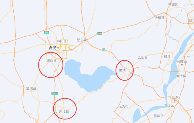 因此,商周的巢国位置,大致在如今的安徽合肥一带,相对于商周都城来说位于南方,似乎又可以被称为“南巢”,而这一带的巢湖、巢湖市等地名,也佐证了巢国在此存在过。而三官庙遗址位于合肥肥西县,与巢湖市、庐江县成三角形,三者围起巢湖(见下图)。也就是说,三官庙遗址大致位于商周巢国境内。