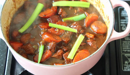 16、待胡萝卜炖熟,放入适量葱即可出锅。