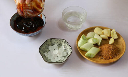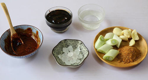 4、准备调料:腐乳用勺子压成酱,冰糖适量,蚝油、柱侯酱、老抽混合在一起,米酒适量、葱蒜适量、十三香适量。