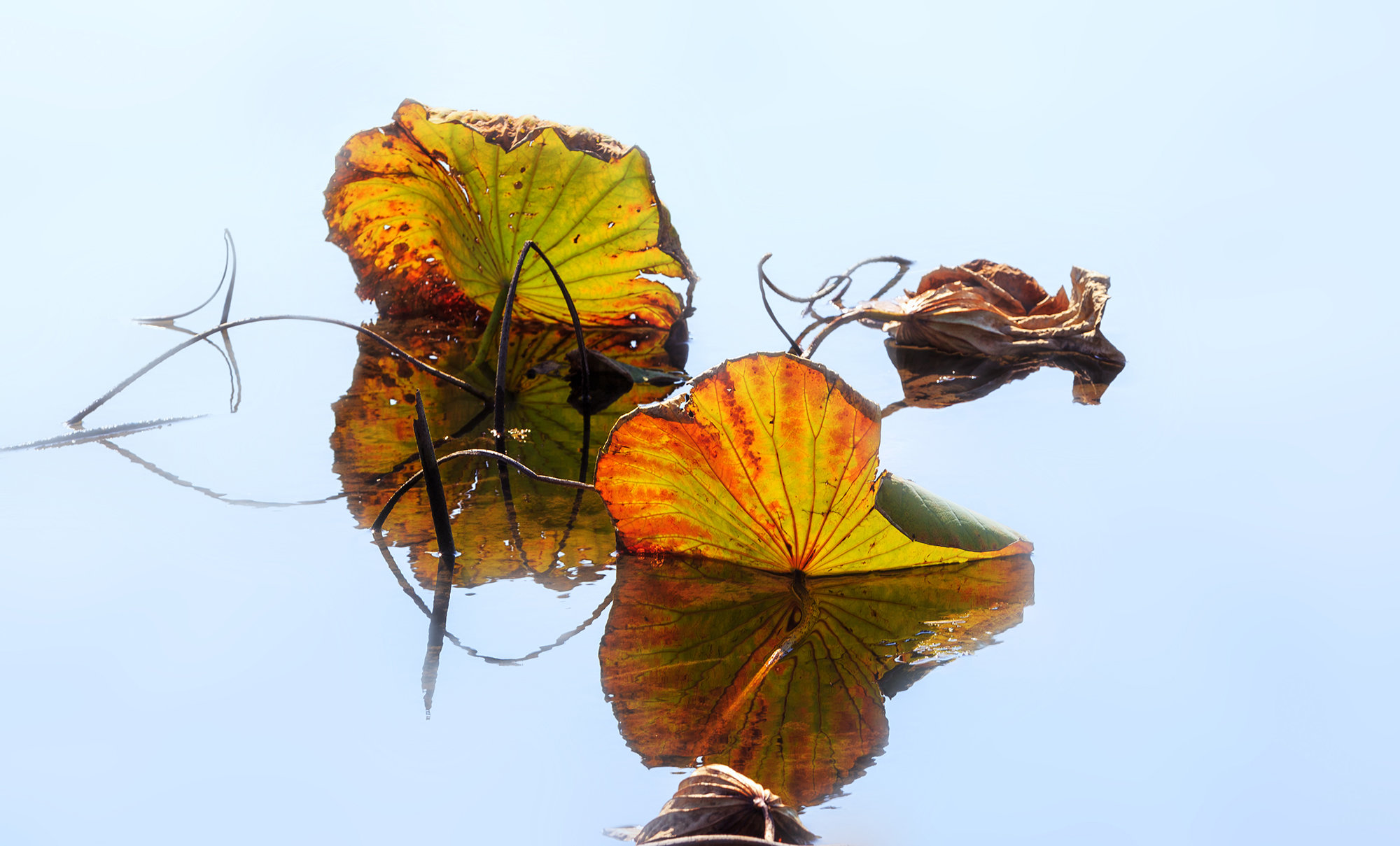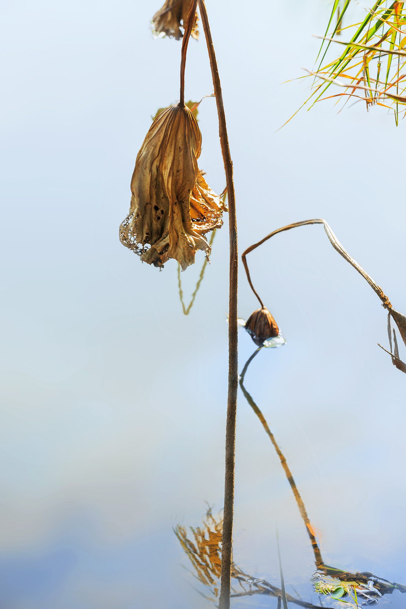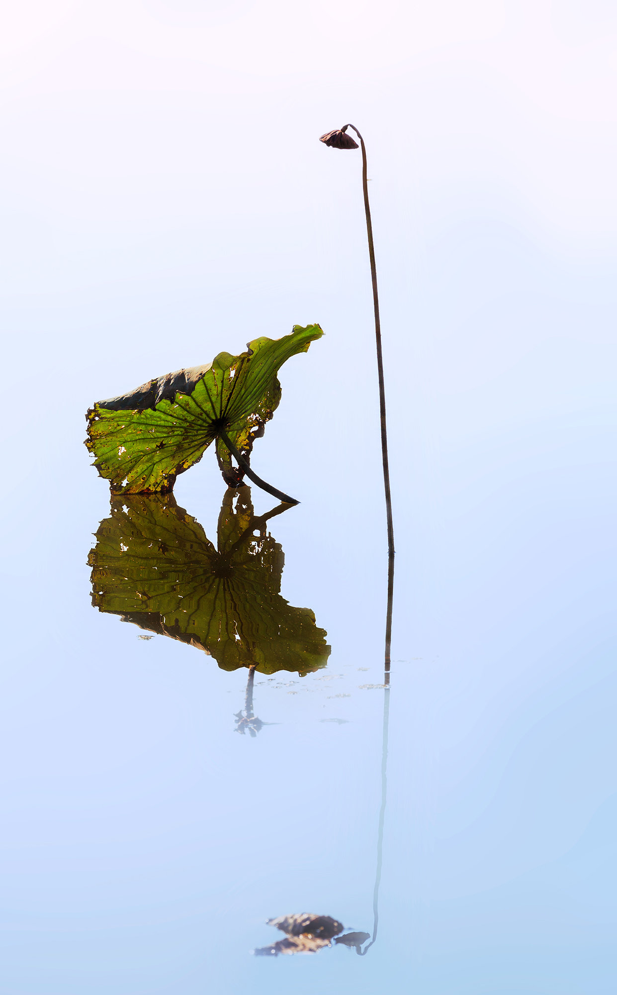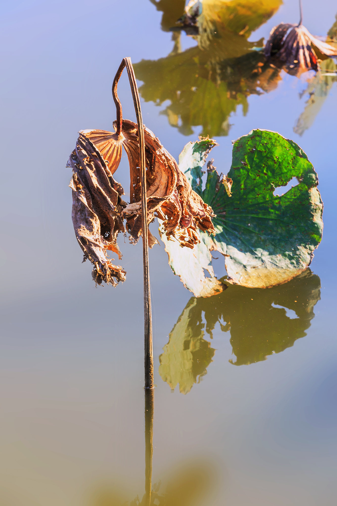 而你再看那斜卧水面的枯叶,倒立水中的梗干,似乎裹挟着摄人心魄的气度,满蓄着生命不息和悄然待发的禅意。