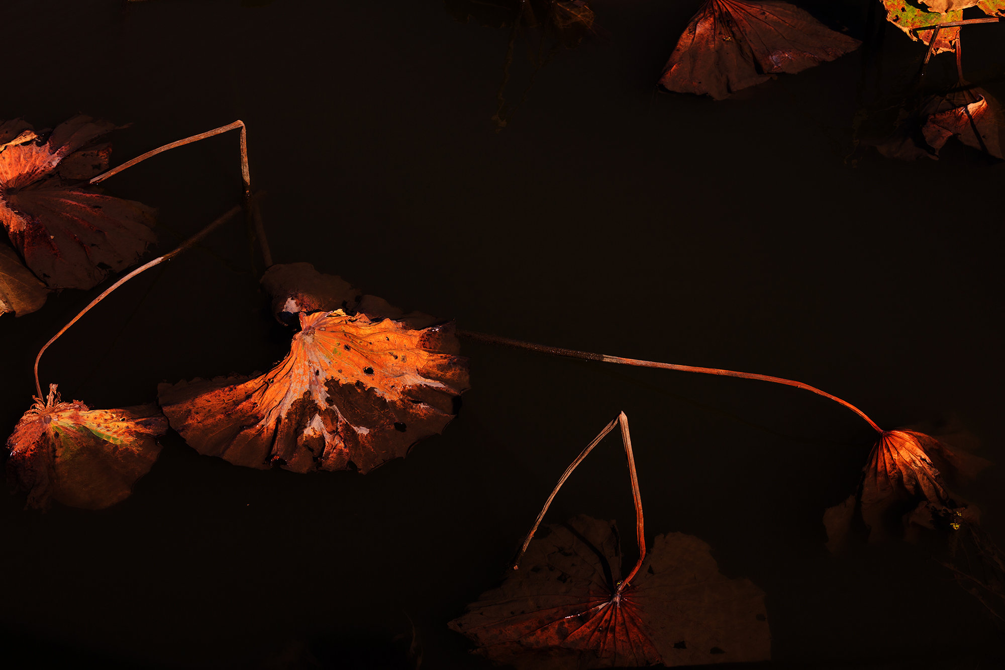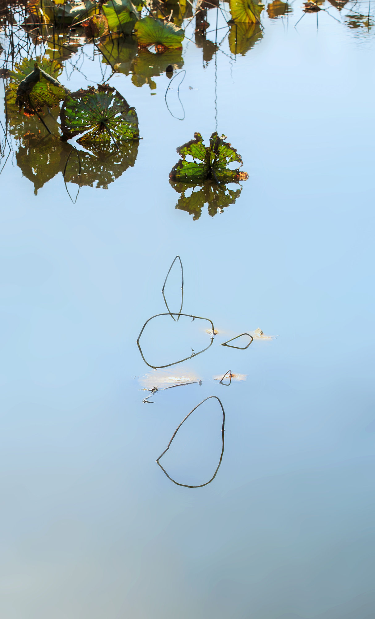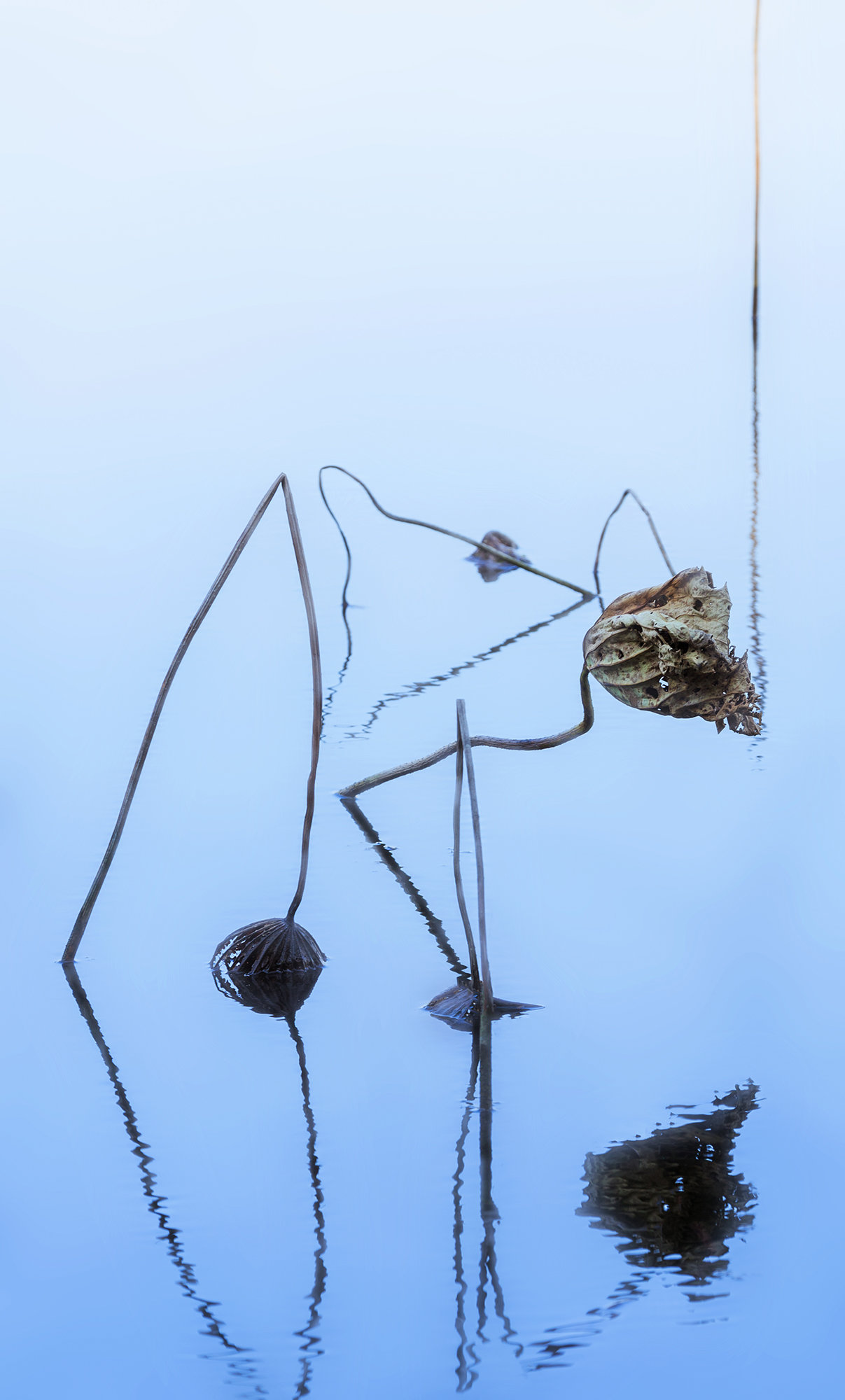 而你再看那斜卧水面的枯叶,倒立水中的梗干,似乎裹挟着摄人心魄的气度,满蓄着生命不息和悄然待发的禅意。