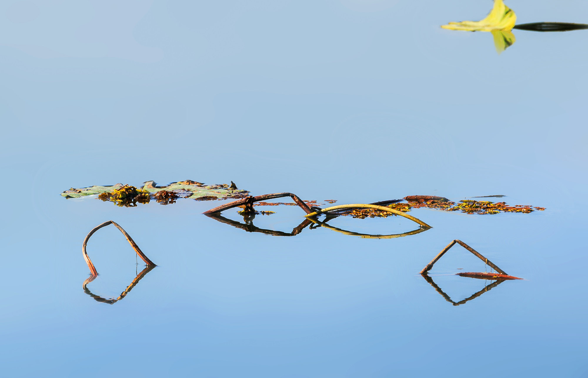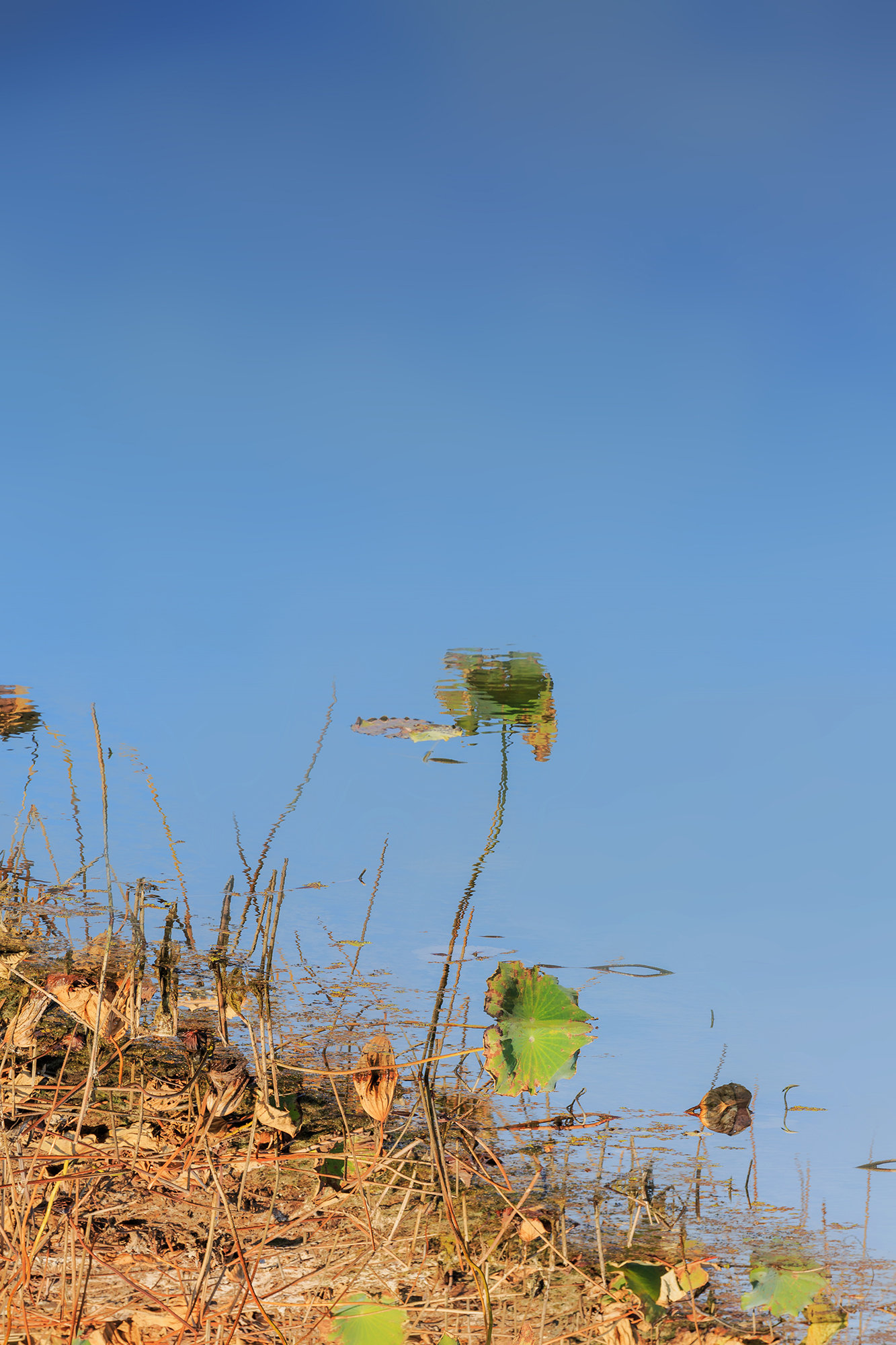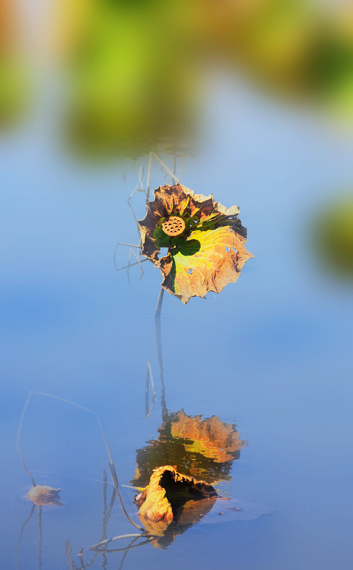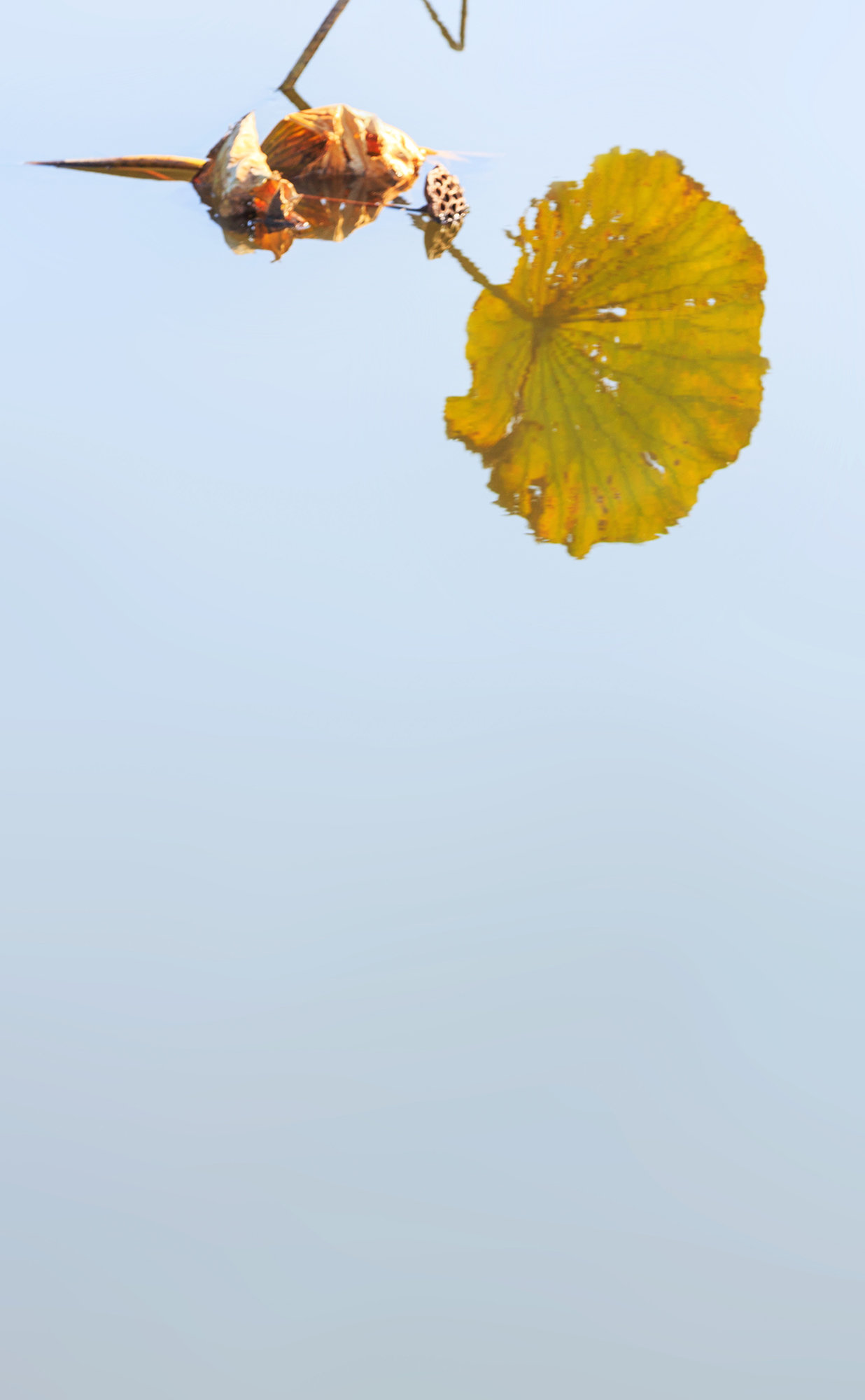 而你再看那斜卧水面的枯叶,倒立水中的梗干,似乎裹挟着摄人心魄的气度,满蓄着生命不息和悄然待发的禅意。