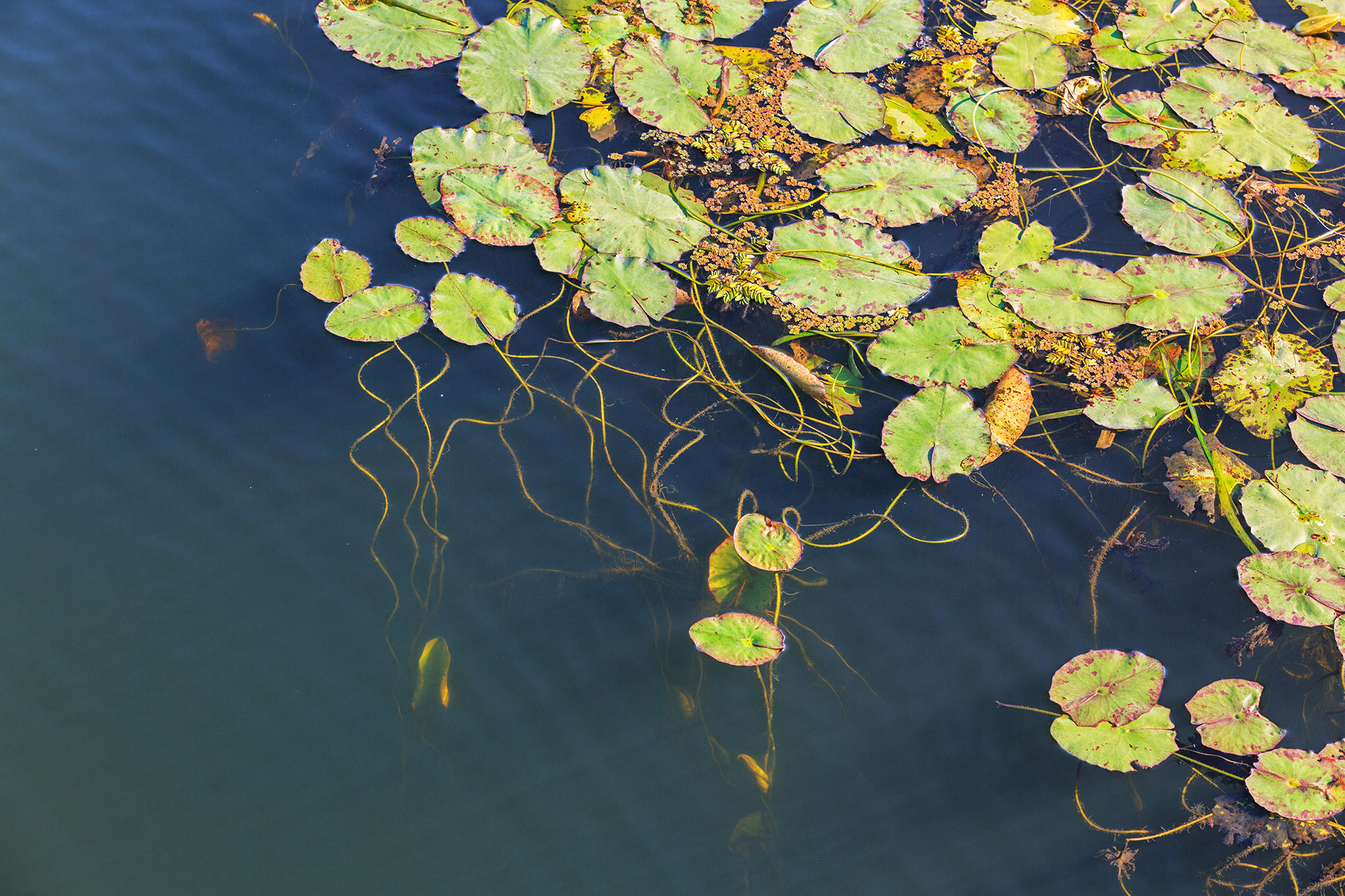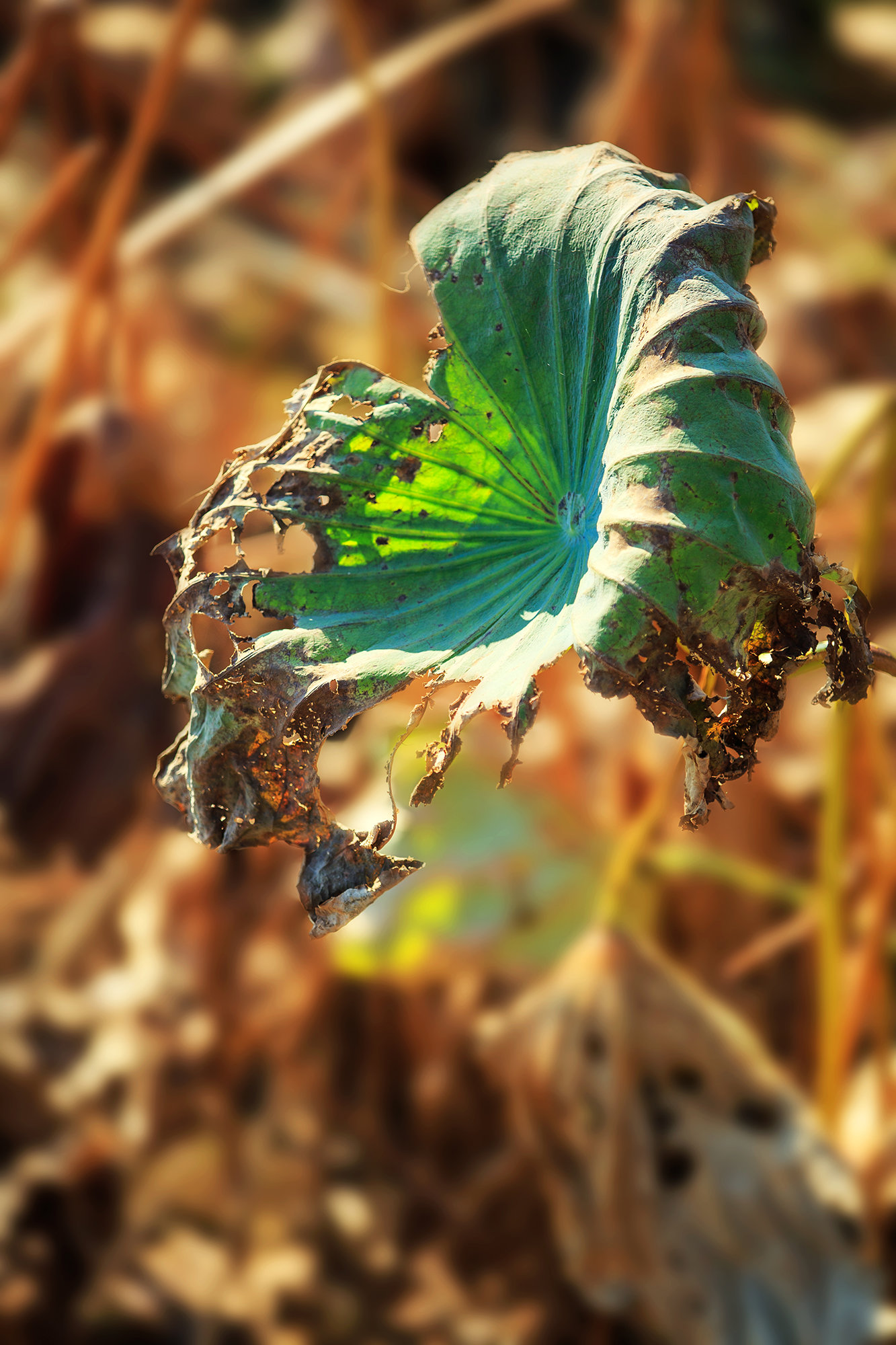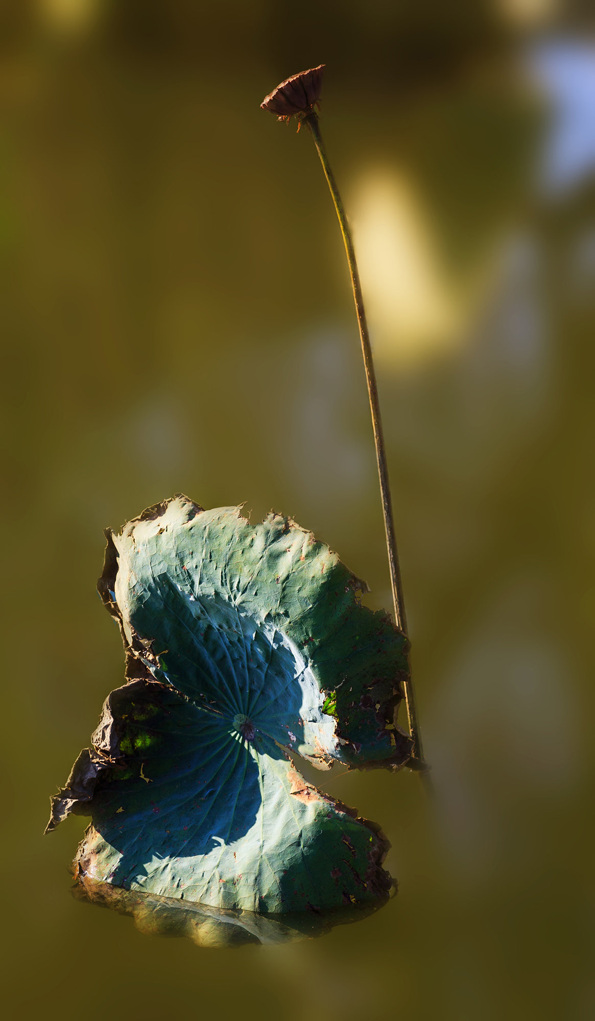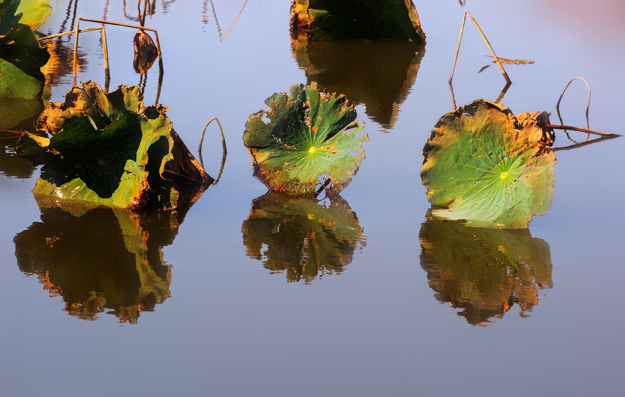 偌大的荷塘里,除却少数挣扎着挽留一丝绿意的荷叶,大都已被风霜侵蚀成丝丝缕缕,空留叶脉,匍匐于水面。