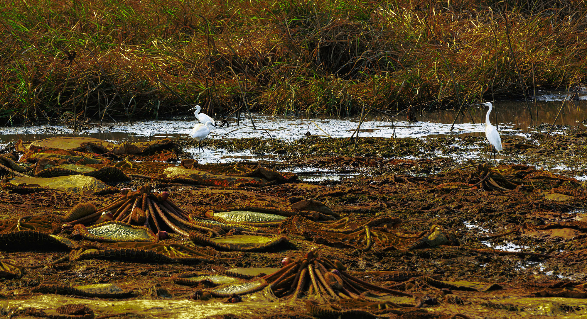 若你翻开这残梗败叶之下的塘泥,你会惊喜地发现,那些埋藏在淤泥深处的莲藕正在伸展萌芽,静静等待着春天的来临,准备生命的再次勃发。
