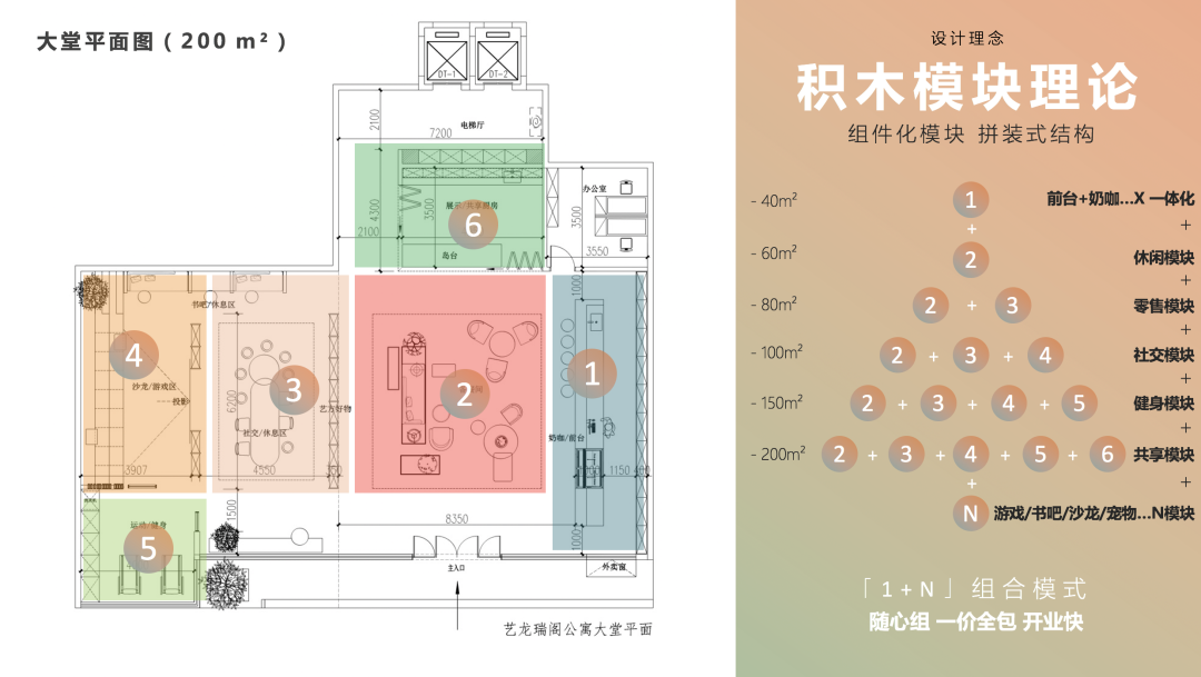 公寓推出的“积木模块理论”,可凭借组件化模块,拼装式结构,以“1+N”组合模式,将空间划分为多个模块,根据不同物业及投资人的多元化需求,如同拼积木一般打造空间。比如在公寓大堂,除了必须要有的一体化前台与休闲模块之外,零售模块、社交模块、健身模块、共享模块等区域,则是由投资人根据大堂的空间大小自主选择,丰俭由人。