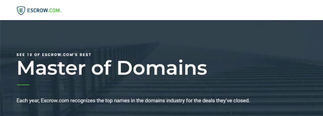 Escrow.com每年都会表彰域名行业的顶尖企业,而“Master of Domains(域名大师·十大交易精英)”是前一年收入(交易金额)最高的十家品牌个人经纪人。