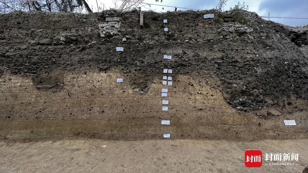 据了解,“新都城”城墙砌筑方式为先在地势低洼处垫土,平整地面,内侧开挖基槽,外侧将早期遗迹填平,再在其上采用版筑方式分段分层平夯,逐层加高墙体,部分区域发现有夯窝痕迹,多为圆形,推测可能用木夯具夯筑,每层小夯层厚约15~30厘米;上部为晚期城墙,最宽处10.5米,残高约0.3米,修建时代为东汉晚期至蜀汉时期,在早期城墙基础上补筑或増筑,城墙外侧底部残存有“新都城”铭文的包砖,内侧则未发现包砖。墙体西部约9.8米处为壕沟,壕沟内侧在晚期城墙时期砌砖。出土遗物有瓦当、板瓦、筒瓦等建筑构件,陶罐、陶钵、支钉窑具、鼓风管、铜箭镞、铜块、铜矛、铁块、铁锸等残件。