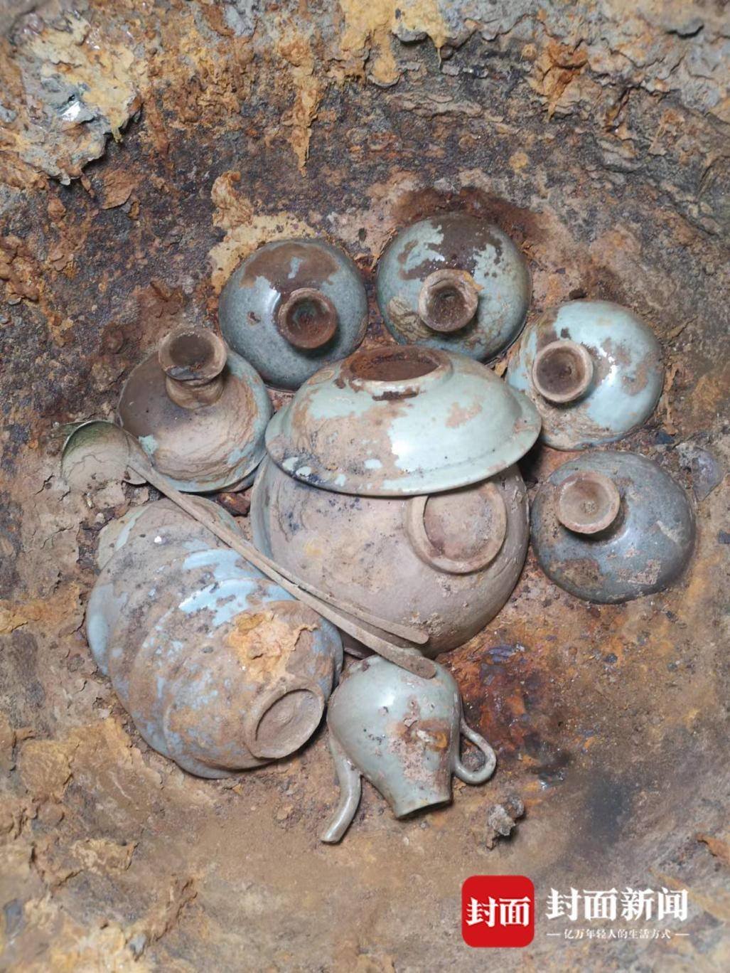 遗址内还出土了明代早期21件龙泉窑东区窑址生产的青釉瓷器,器形有高足盘、碗、盘、壶等,有趣的是,这些瓷器都放置在由三口铁锅上下扣合的一处窖藏内。