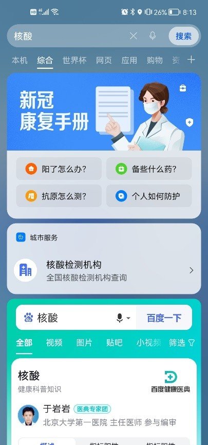 除此之外,你还可以通过搜索“核酸”来查询全国核酸检测点。如果想随时随地了解相关资讯,只需要桌面下拉都能满足你,这么便捷的工具还不赶快用起来?特殊时期希望大家保持镇定,冷静浏览相关资讯,科学备药,谨慎防护,一起度过这段难关。