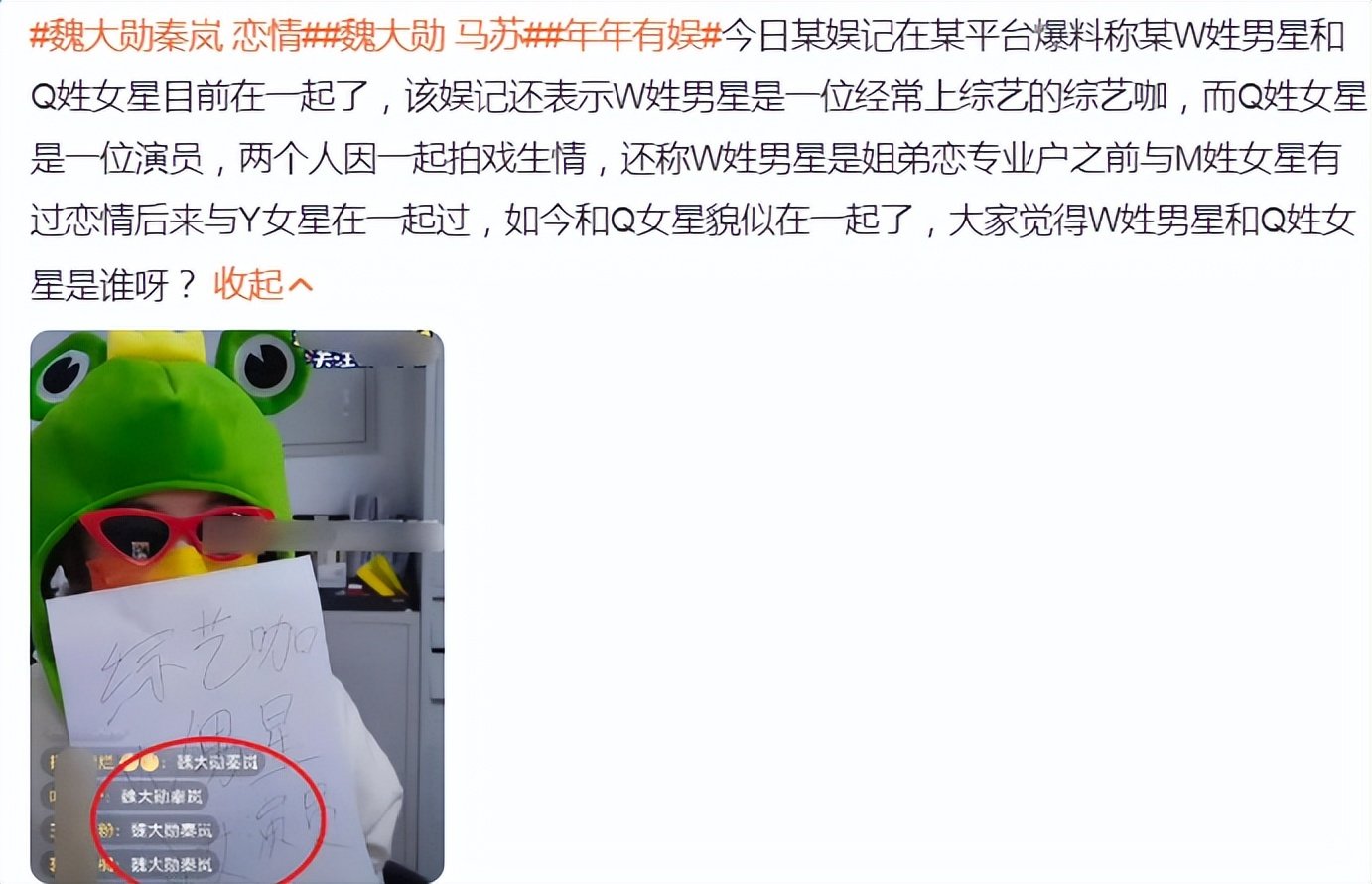 很快,有网友根据直播的内容,直指恋情双方是秦岚、魏大勋。