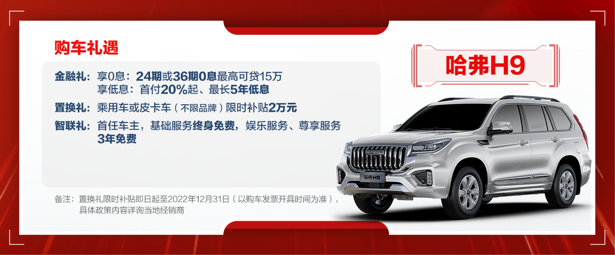 综合来看,哈弗H9在核心的动力性能上确实比传祺GS8要更高阶,更令人心动的是哈弗H9还在最近推出了多项福利礼包,包括首付20%起,最长可贷5年;或可享3年0息,日供最低93元的金融礼,以及两万元置换补贴礼等实实在在的优惠举措,这么好的机会何不购买一辆哈弗H9,犒劳犒劳忙碌一年的自己。
