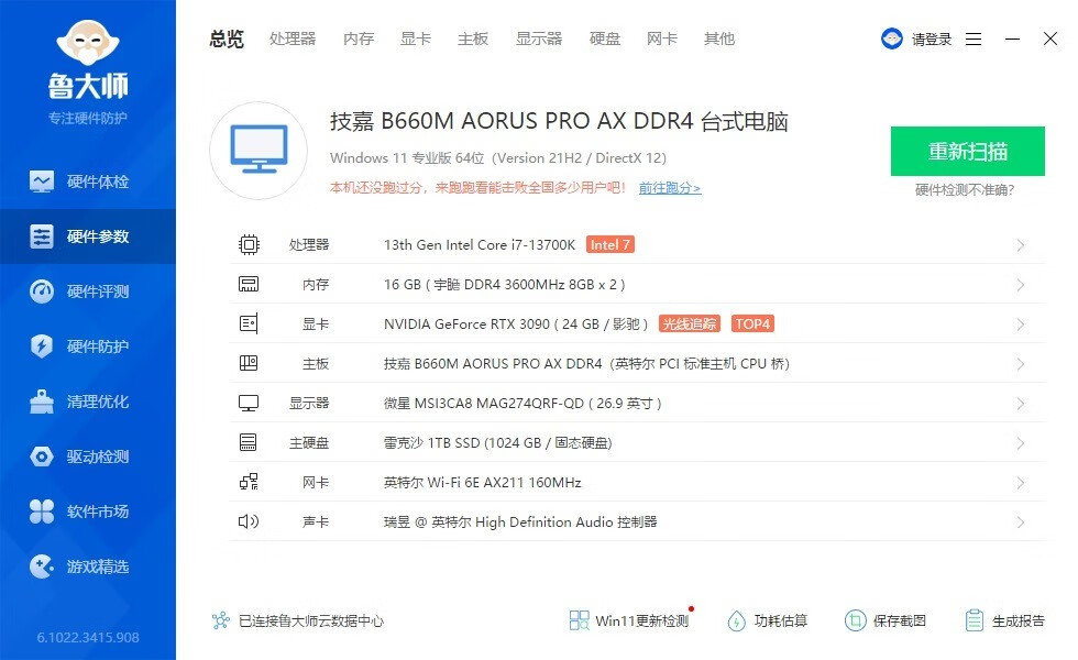 ▼整机配置一览,处理器是13700K,主板是技嘉的B660M雪雕AX D4,显卡是影驰的RTX3090星耀OC。