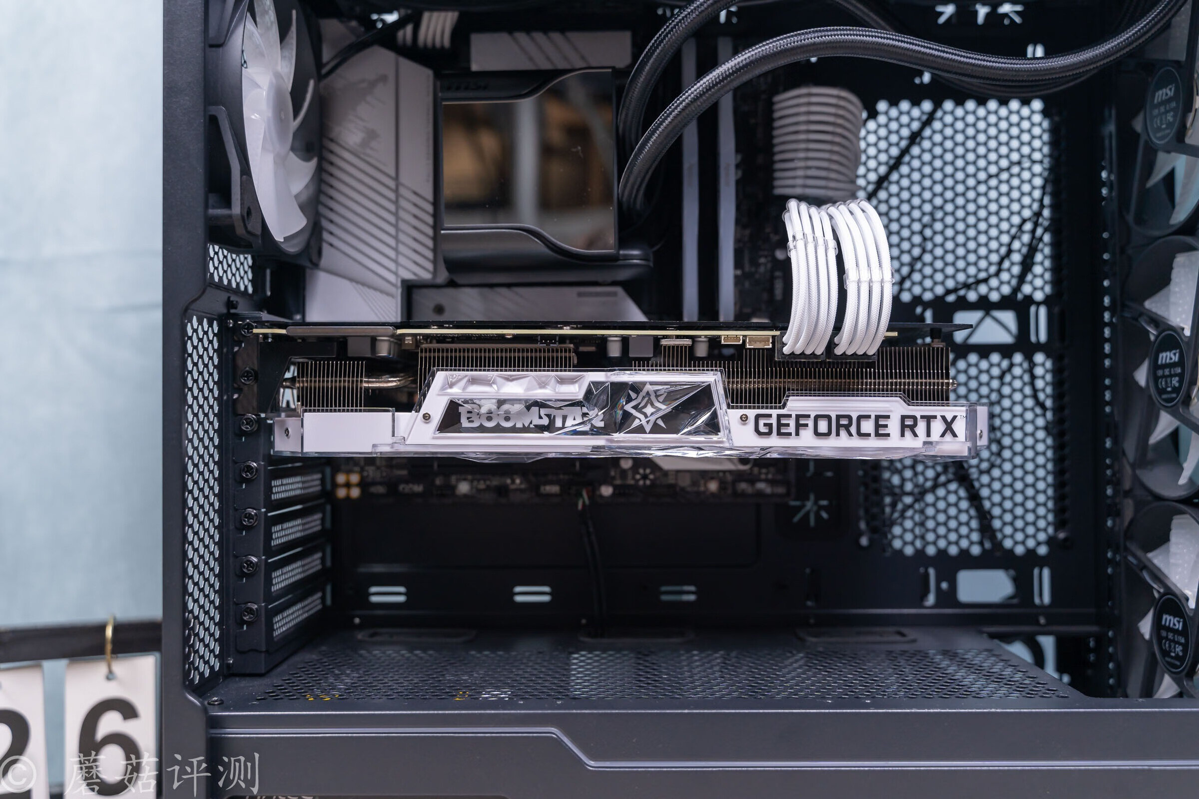 ▼显卡默认横置安装,然后把供电接口的线材安装好。