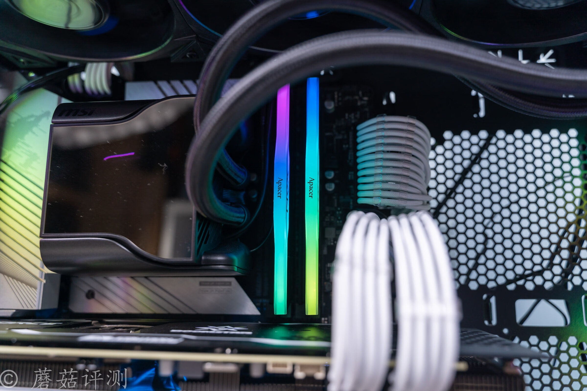 ▼内存用的是宇瞻的NOX暗黑女神内存,8G*2 3600MHz。这套内存的颜值非常漂亮,内存条顶部有面积硕大的灯条,灯效柔和,过渡顺滑,效果不错。