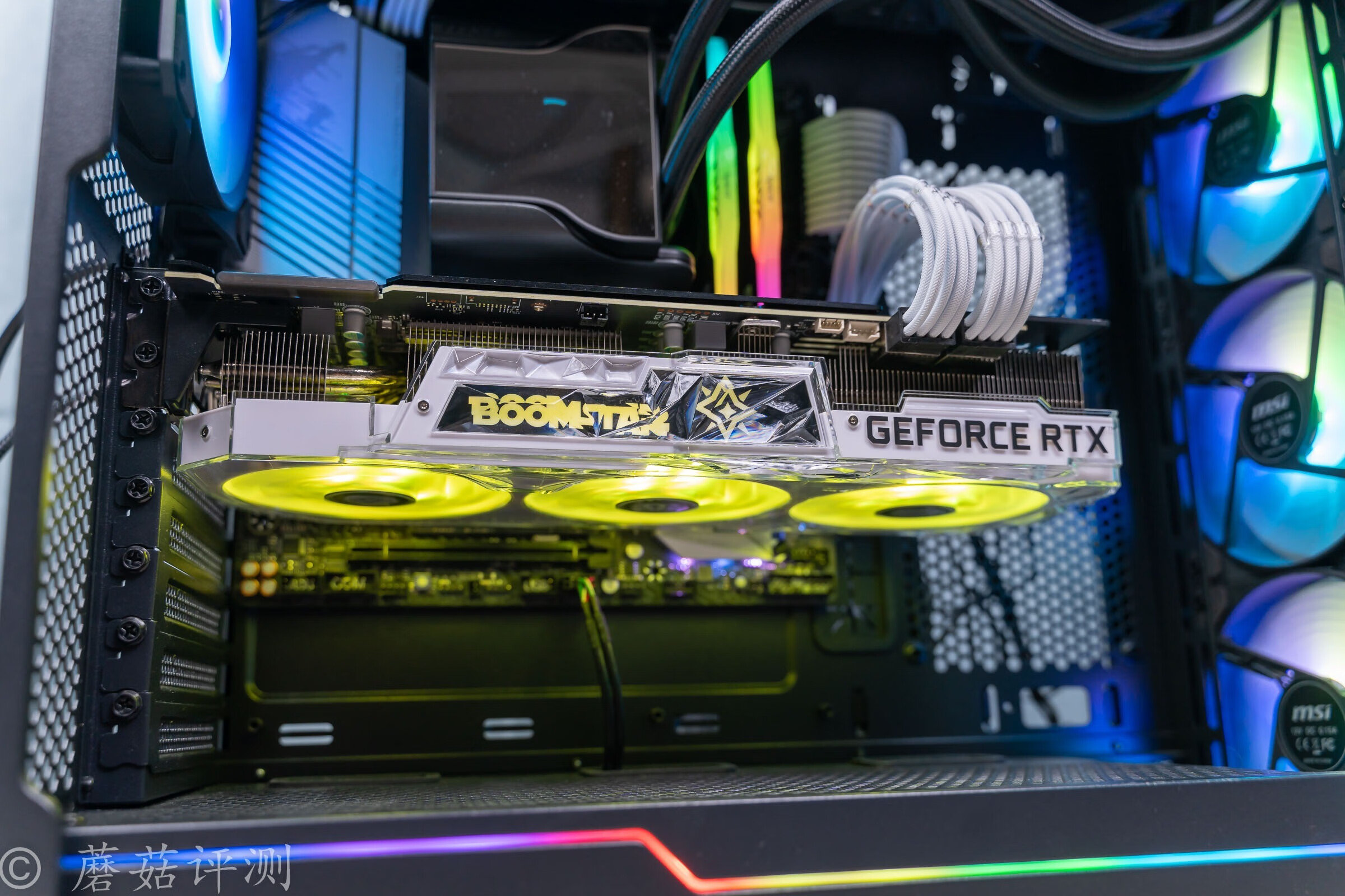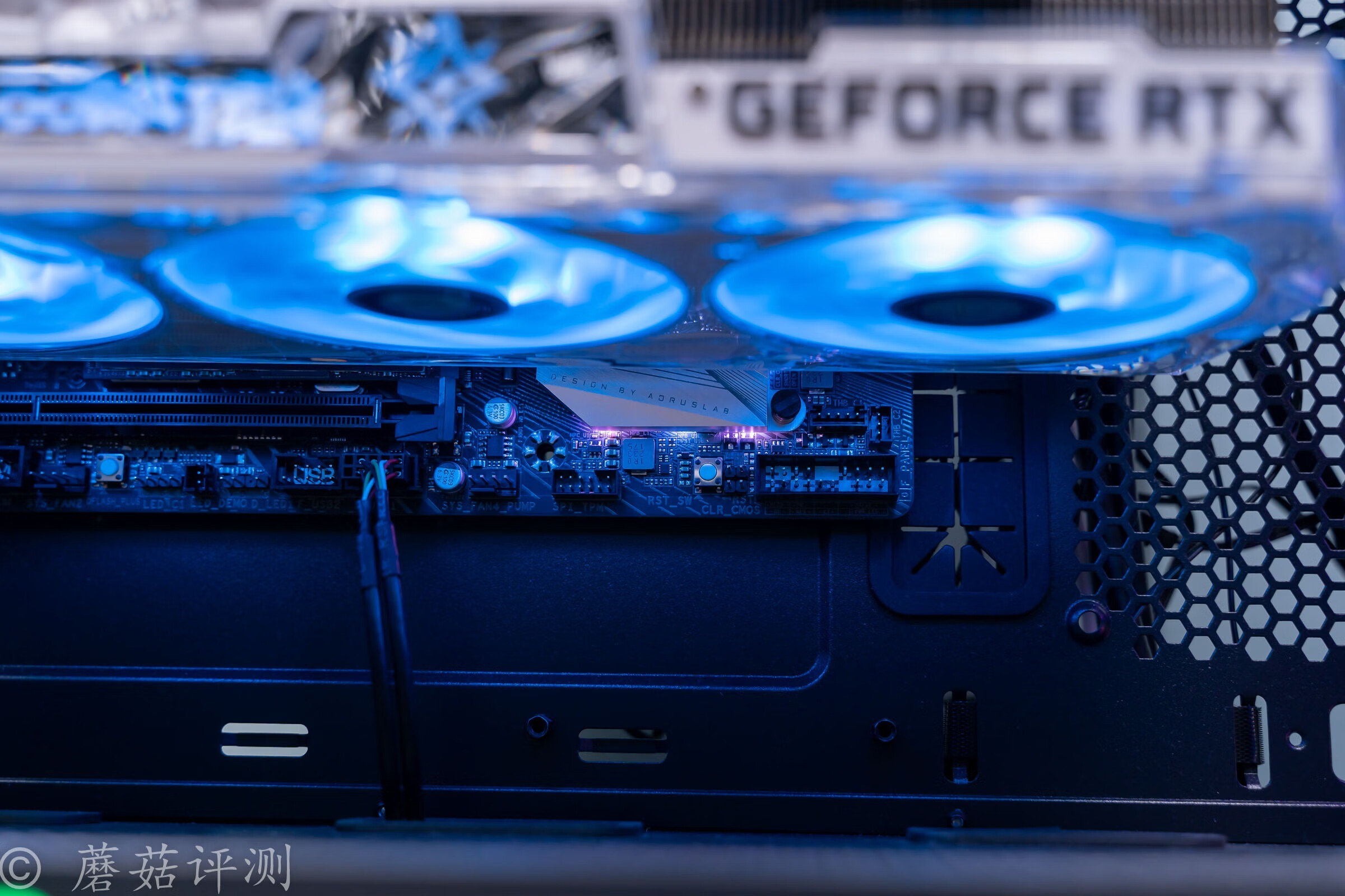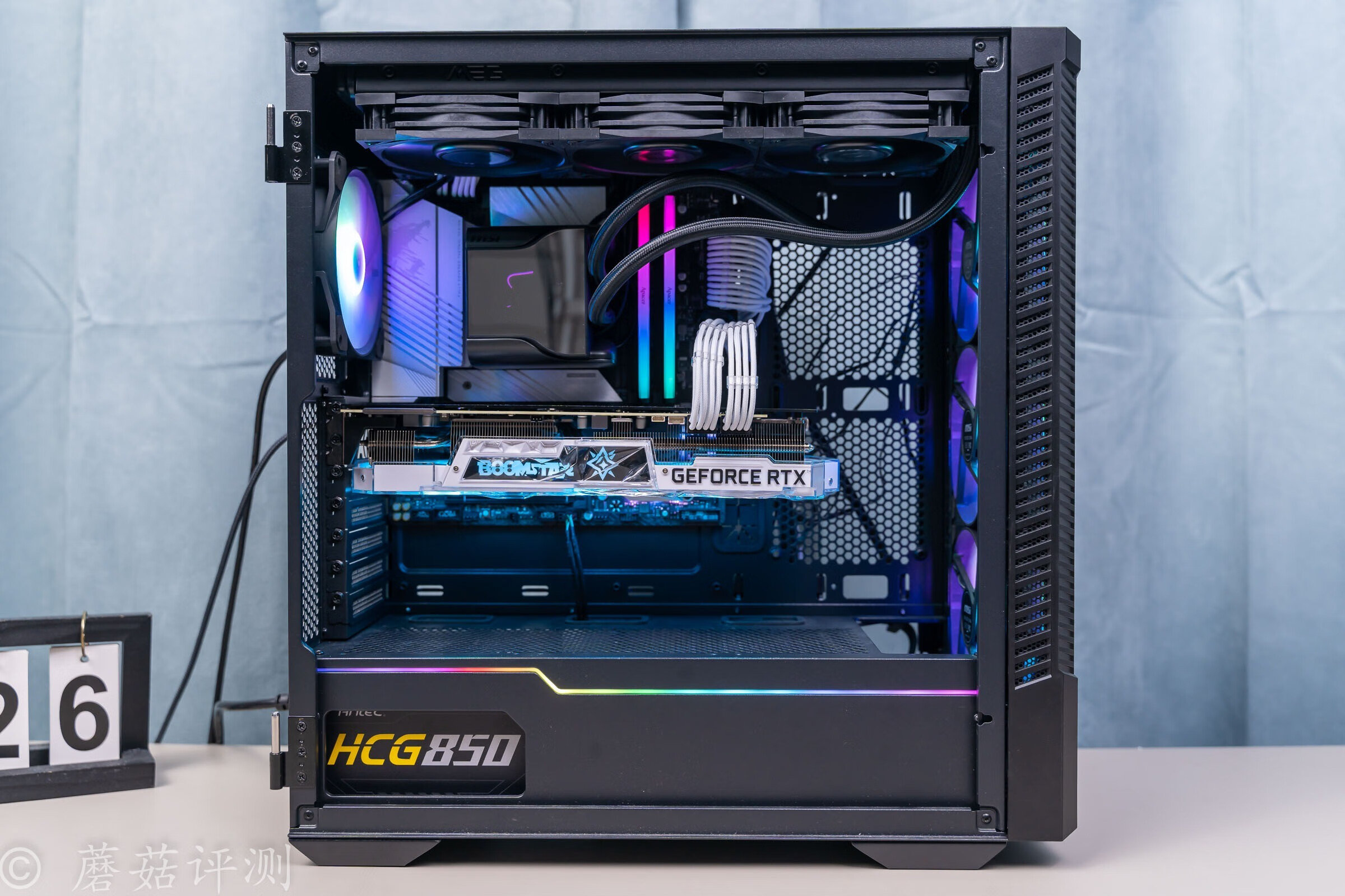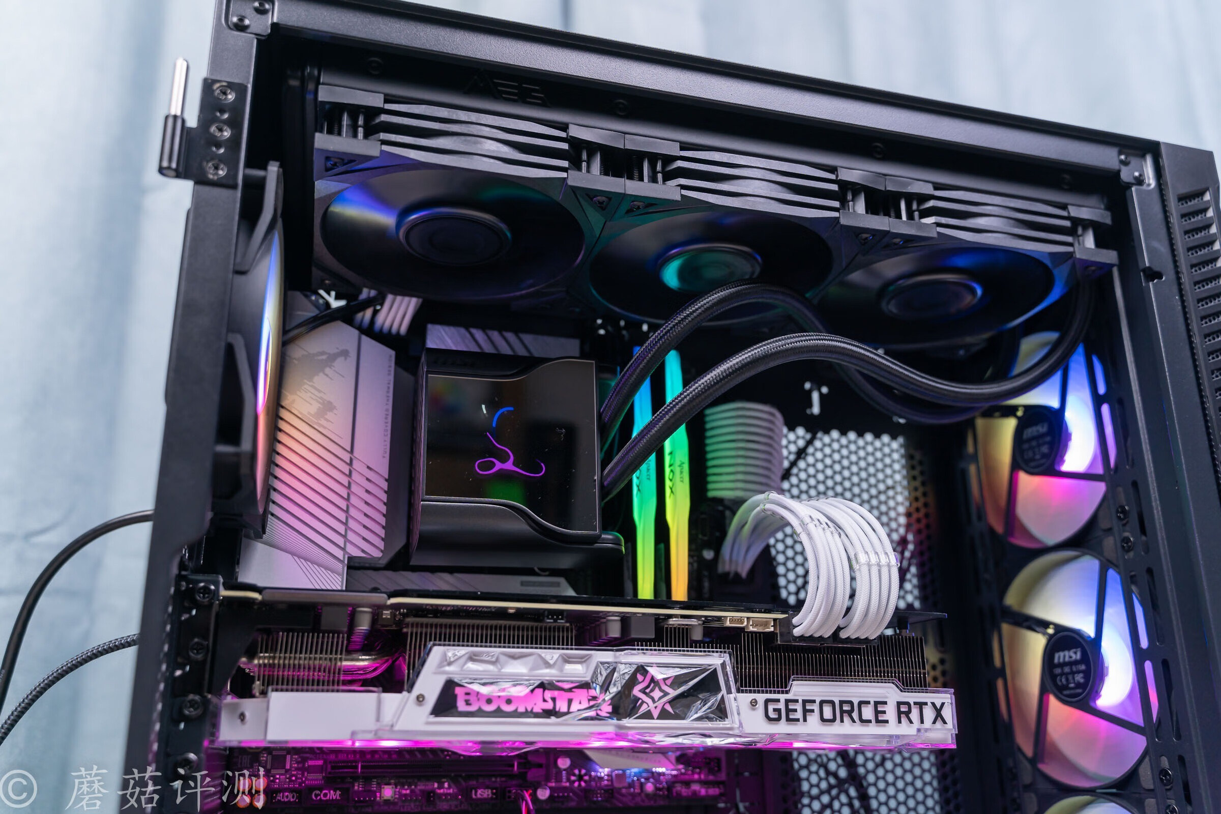 ▼机箱用的是微星的刀锋100R机箱,机箱前部的颜值非常漂亮,有一个面积硕大的玻璃侧透,内部标配了三把支持ARGB灯效的机箱风扇,搭配起来的效果很不错。