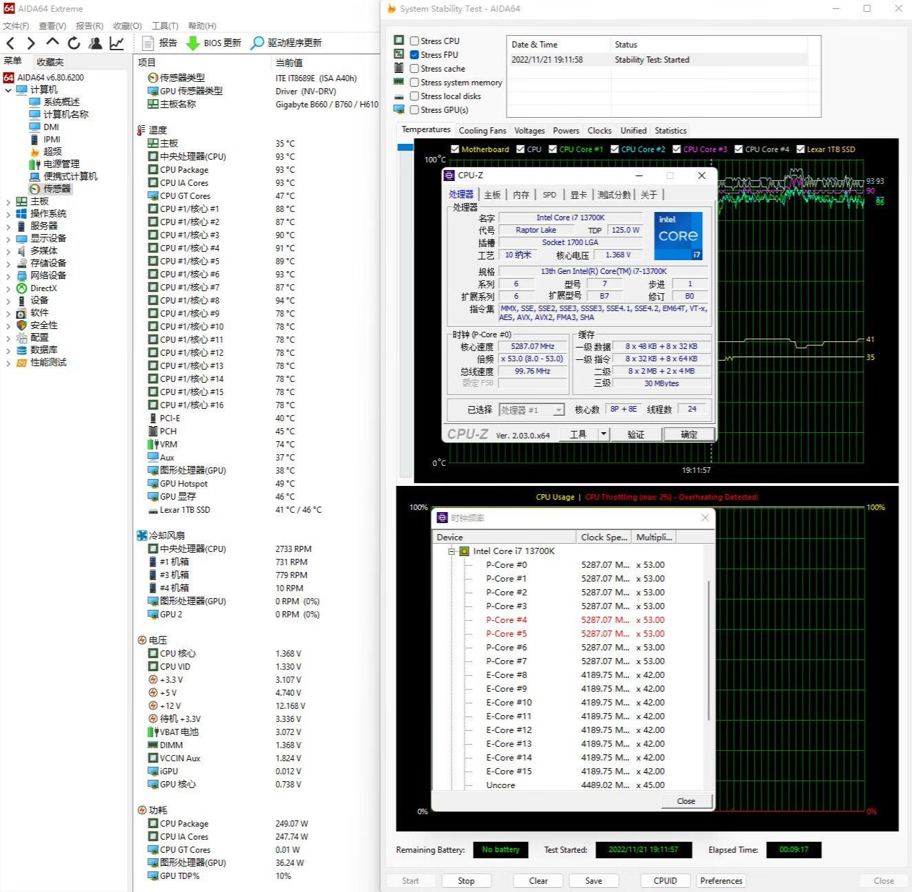 ▼单烤FPU测试,10分钟,处理器功耗250W左右,大核心睿频5.3GHz,小核心睿频4.2GHz,处理器温度在93℃左右,大核心温度在90℃左右,小核心温度在78℃左右,供电部分温度在74℃左右,整体表现还不错。