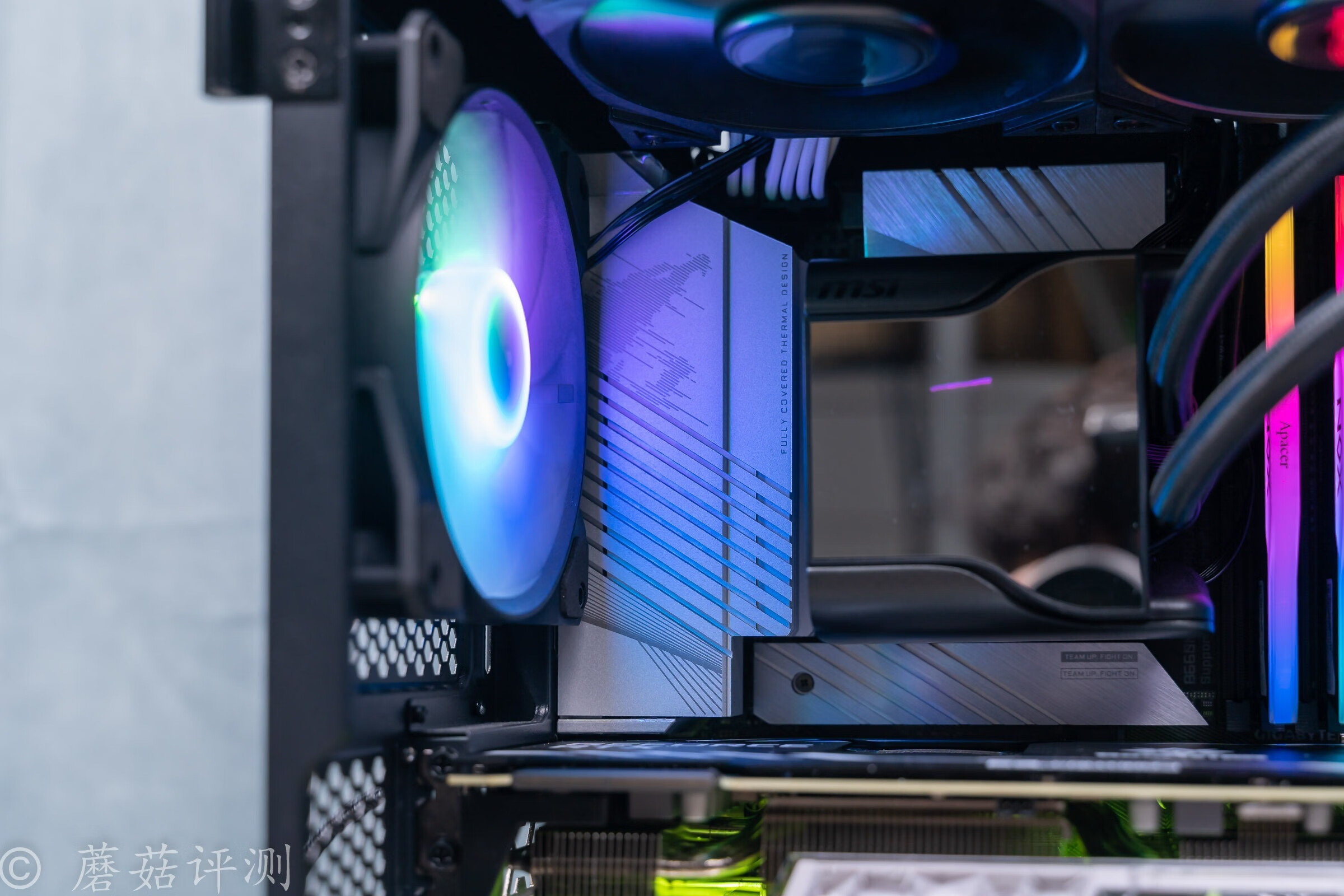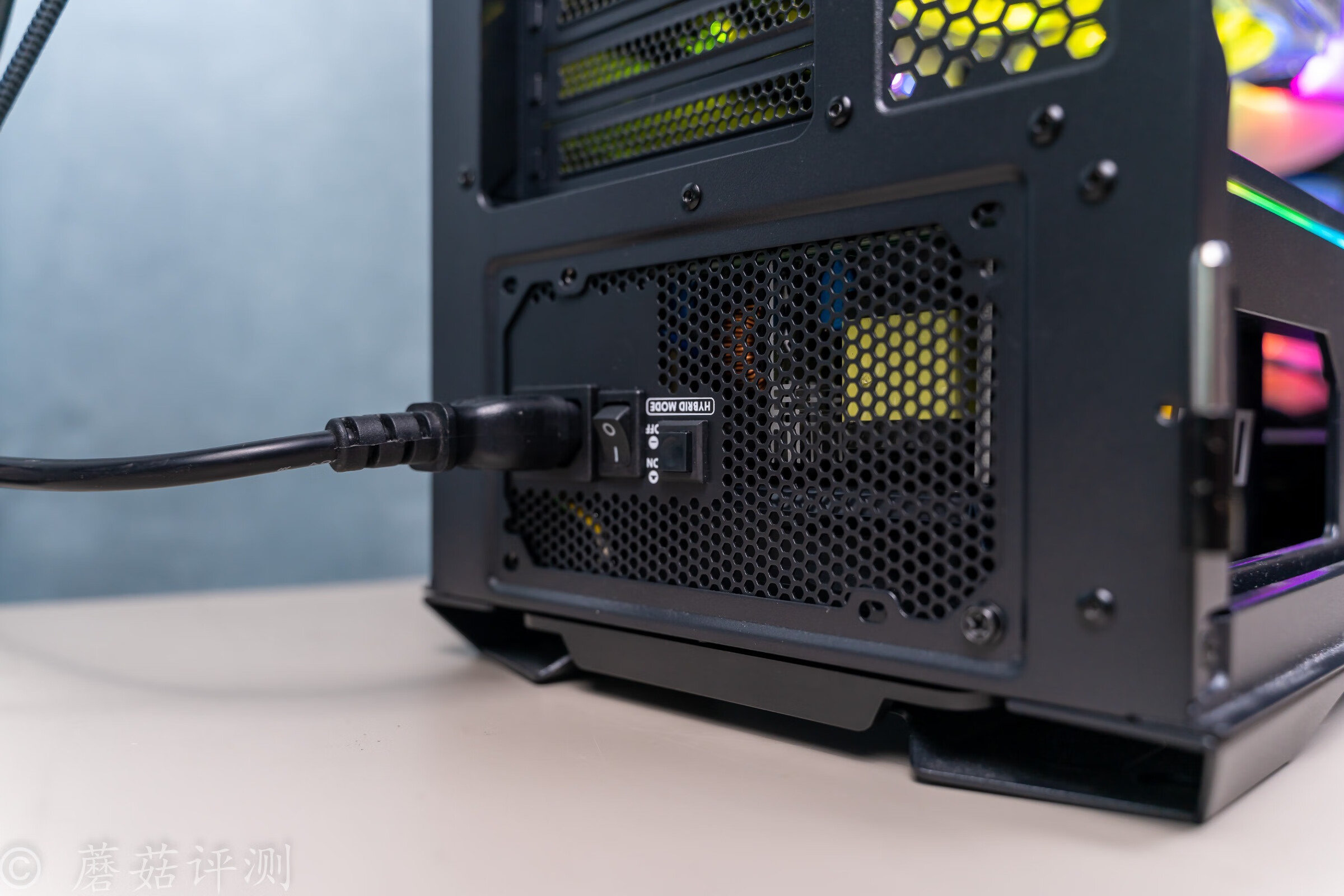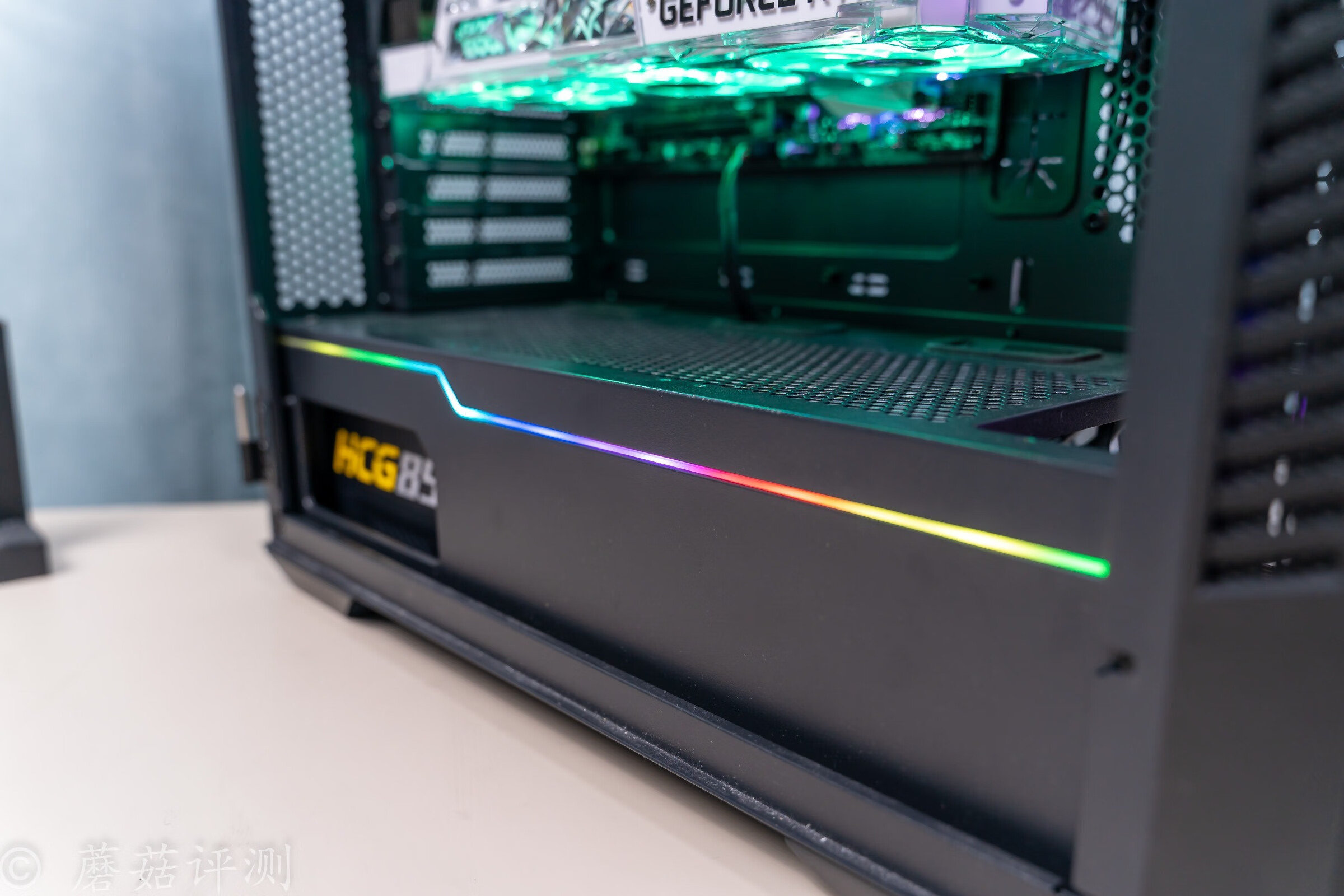 ▼机箱的底部是独立的电源仓,电源仓的侧面的顶部还有一条ARGB灯带,效果很漂亮,颜色过渡均匀。