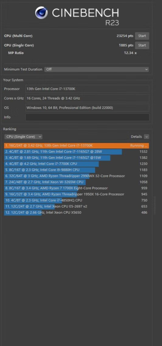▼跑个Cinebench R23,单线程1885,多线程23254,性能很强。