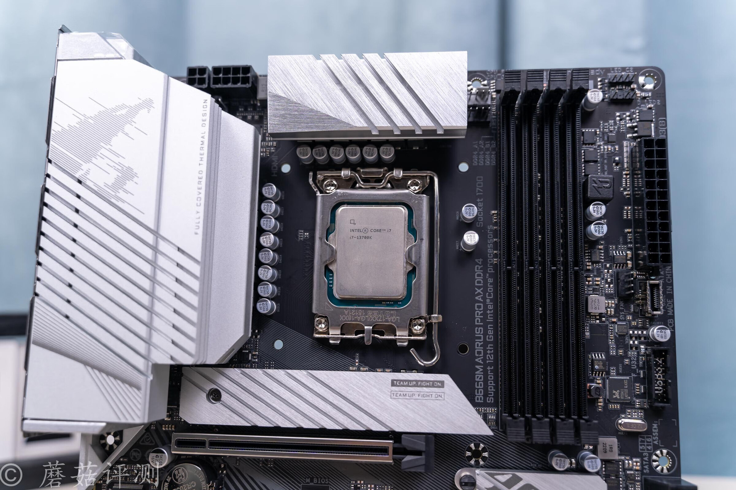 另外,一些定位稍微高端一些的B660主板,其用料也非常不错,可以轻松应付13代功耗比较高的一些处理器型号,例如13700K、13900K等。前两天正好蘑菇朋友买了一块技嘉的B660M雪雕AX D4主板,蘑菇这里用13700K测试下,看看供电效果如何。