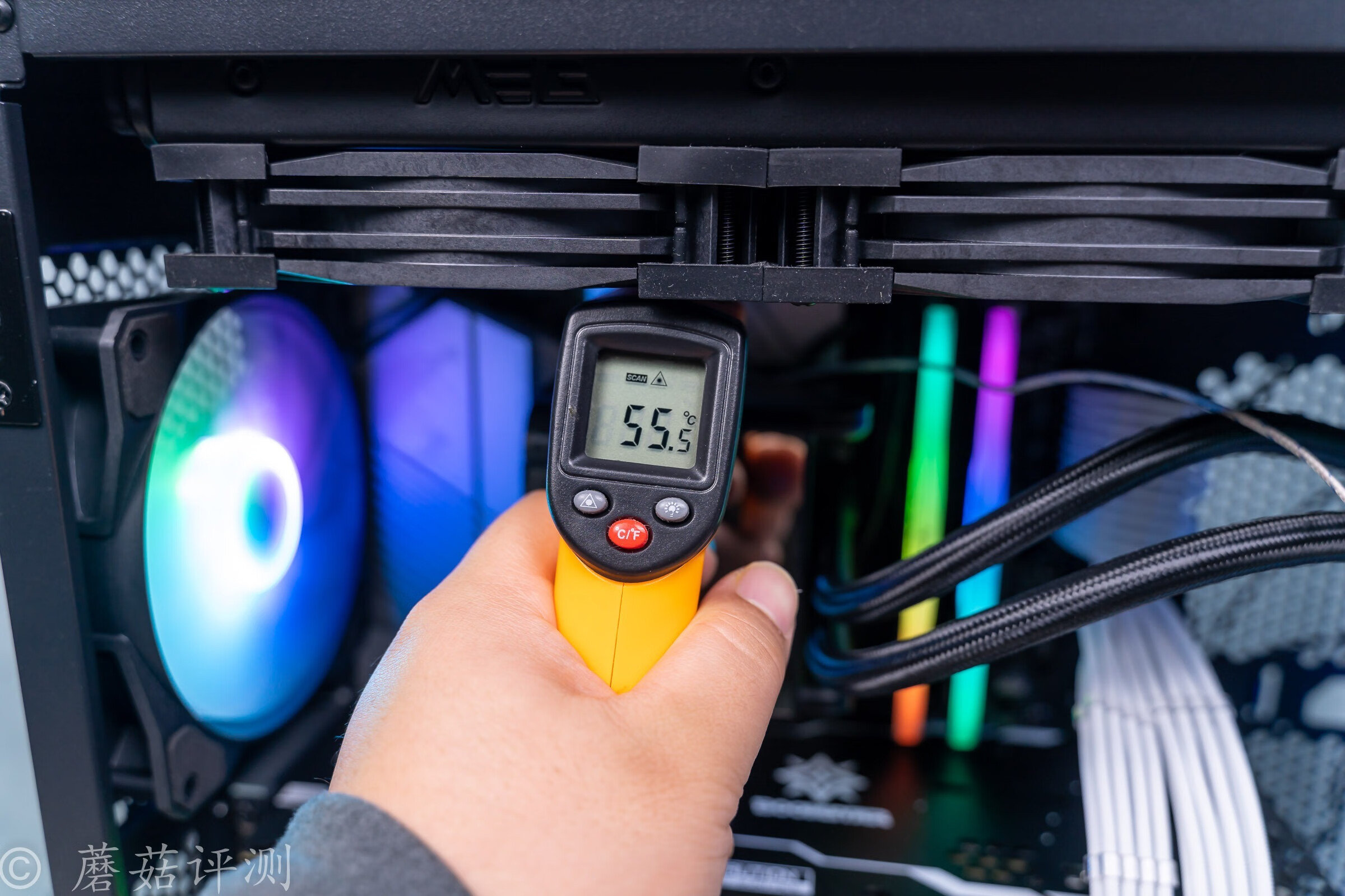 ▼简单用温枪打一下,主板供电部分的最高温度在主板的上侧供电部分,大约在55.5℃左右,也是非常不错的温度了,这块主板的供电,可以轻松应付13700K的默频功耗需求。