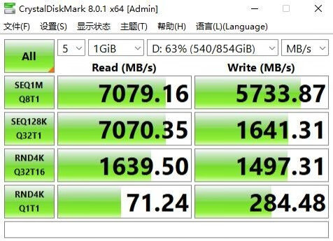 ▼固态的顺序读取速度在7070MB/s、写入5730MB/s,4K读取71MB/s、写入284MB/s,性能很强。