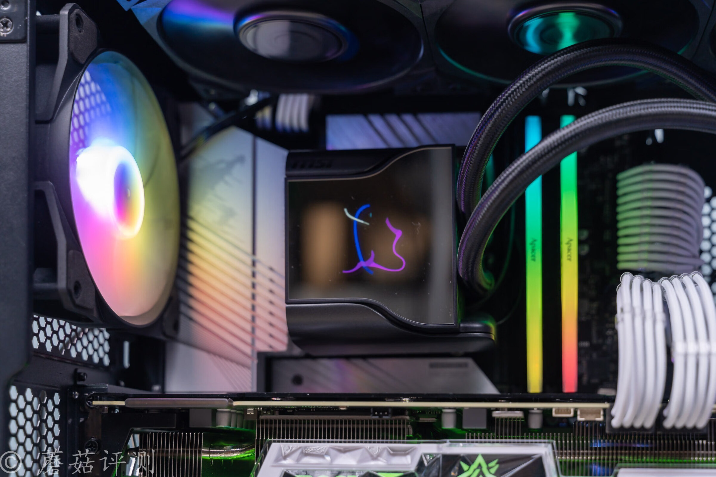 ▼水冷用得是微星的战神S360水冷,水冷头的顶部有一块小的液晶屏幕,可以显示图片、动图、文字、参数等,玩法还是非常多样的。