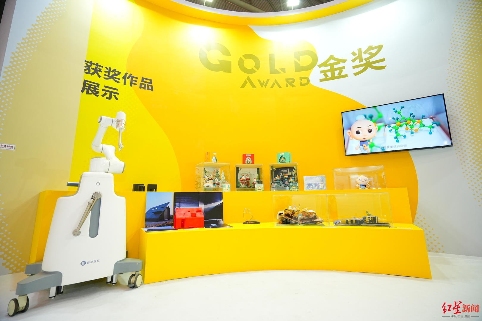 值得一提的是,今年的“金熊猫天府创意设计奖”金银铜奖区阵容显得格外强大——时尚创意设计类金奖《慢物质-锡木作-弥生茶仓》、数字创意设计类金奖《灸童说:中医药献给世界的礼物“青蒿素”》、工业创意设计类金奖《“妙髓”全场景智能骨科手术机器人》、文旅创意设计类金奖《孩子之间上的非遗Ⅱ天府之旅》及空间创意设计类金奖《榭 Wooden Pavilion 1》五大类别金奖作品及特别奖“幸福天府·成都礼物”金奖《旅行熊猫系列文创产品》集体亮相。C型移动式X光射线机、子母熊猫餐具、Black wine label、变脸盖碗等银奖及铜奖作品的近百件产品,也都以影像、实物或模型的形式在现场进行了展示,吸引不少创意设计企业及爱好者现场打卡。