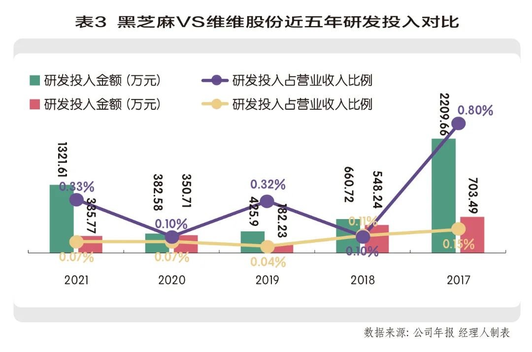 研发创新以“外援”为主,专利布局单薄。从表3来看,黑芝麻在研发投入上其实并不弱于维维股份,并且在资金投入上还常常数倍高于后者,比如2021年、2019年、2017年等;但是从研发人数及其占比总公司人数来说,黑芝麻虽稳定性较强,但研发人数占比却非常低,近五年来,黑芝麻的研发人员长期徘徊在十余人。以2017年为例,黑芝麻产品研发共有三大品类,14个新品研发成功并上市,其中轻脂饮品有3个系列6个品种;已研发成功但未上市的储备产品有小黑小蜜3大系列5个品种,但当年研发人员仅11人。是否其创新效率如此之高呢?