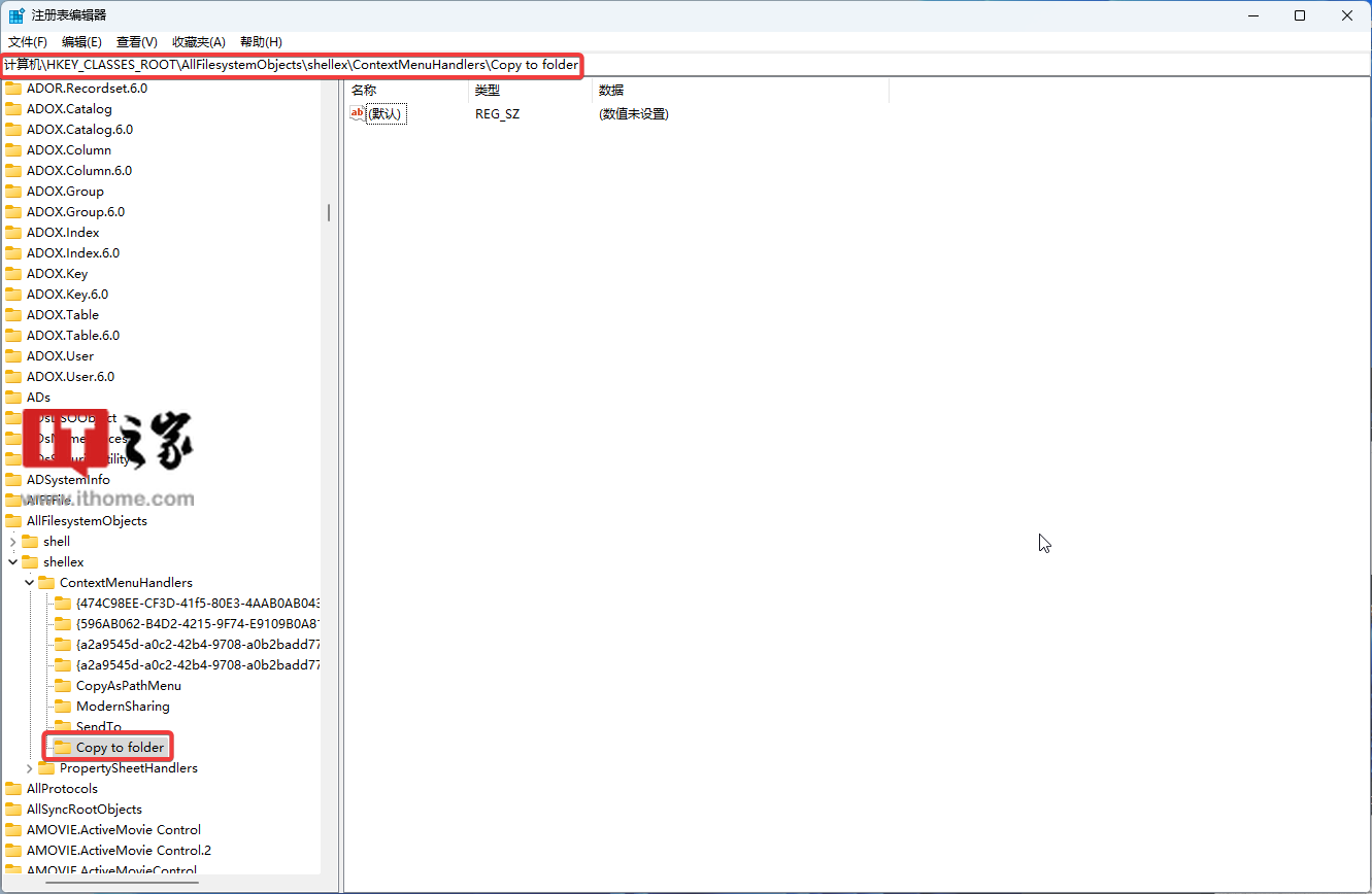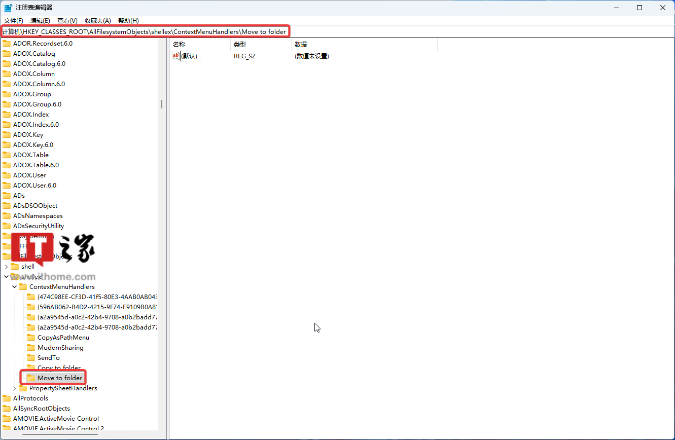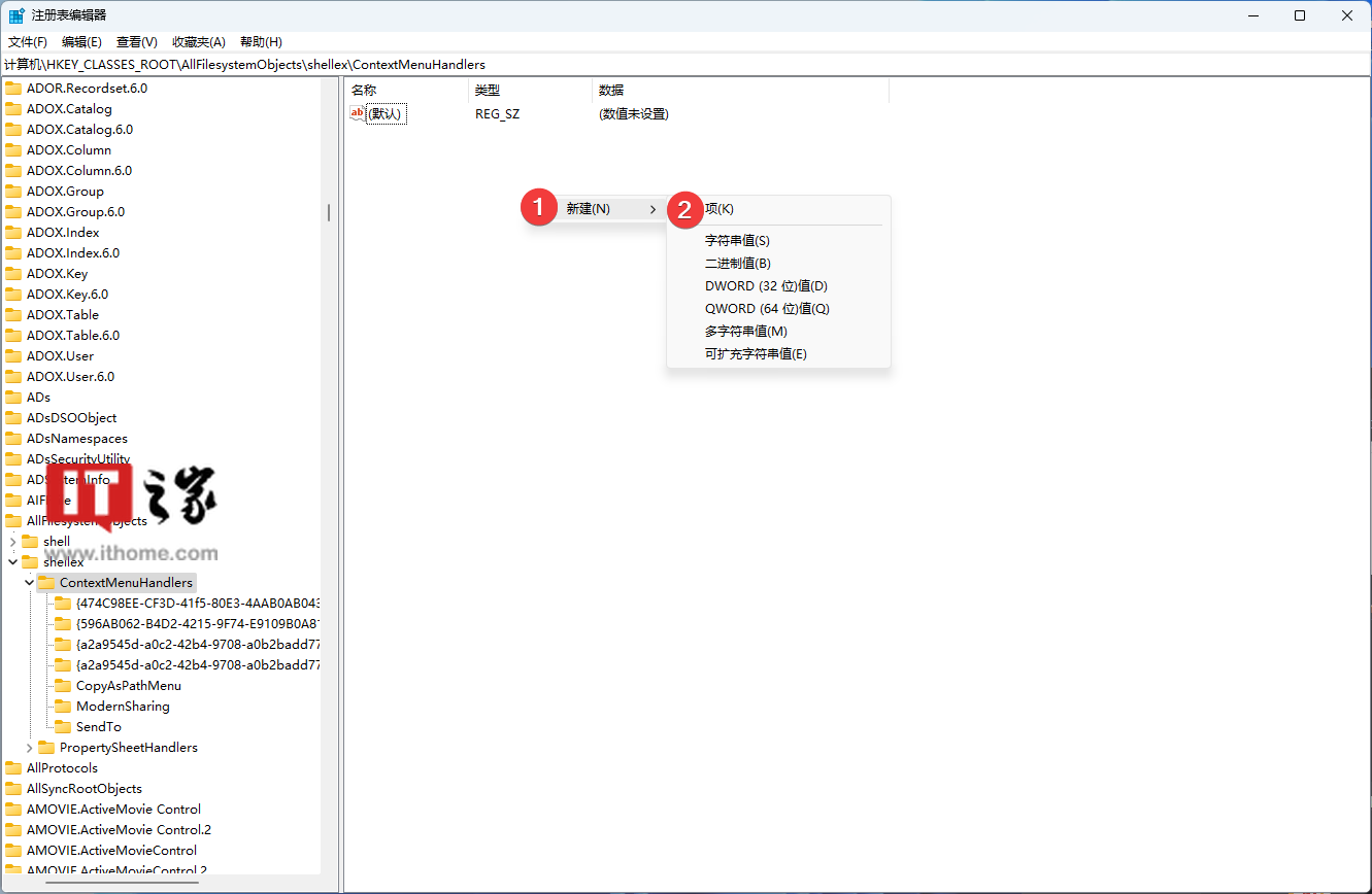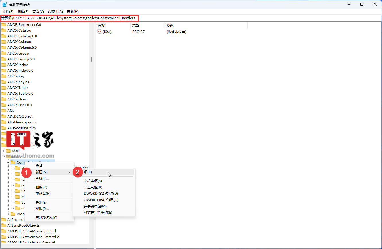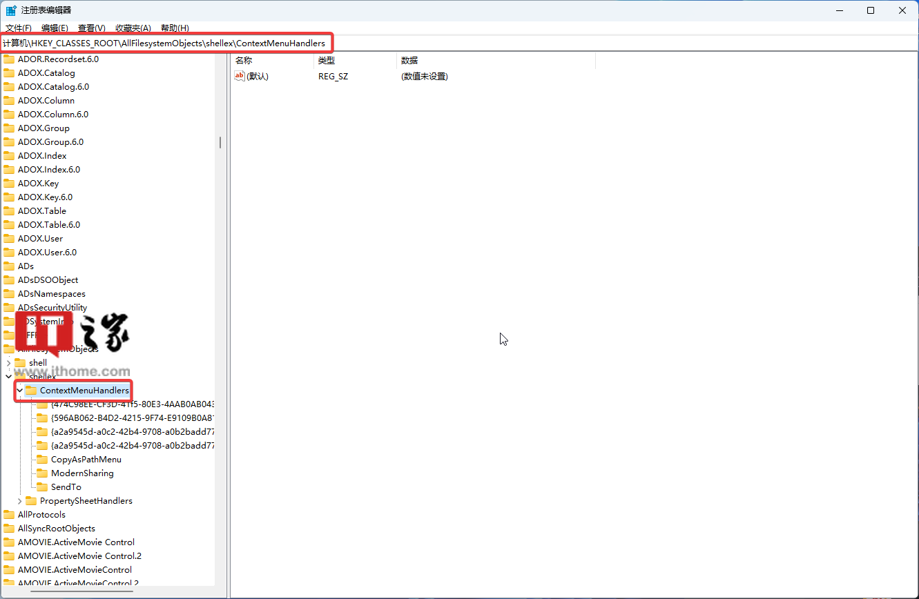 3. 打开 HKEY_CLASSES_ROOT\AllFilesystemObjects\shellex\ContextMenuHandlers 路径